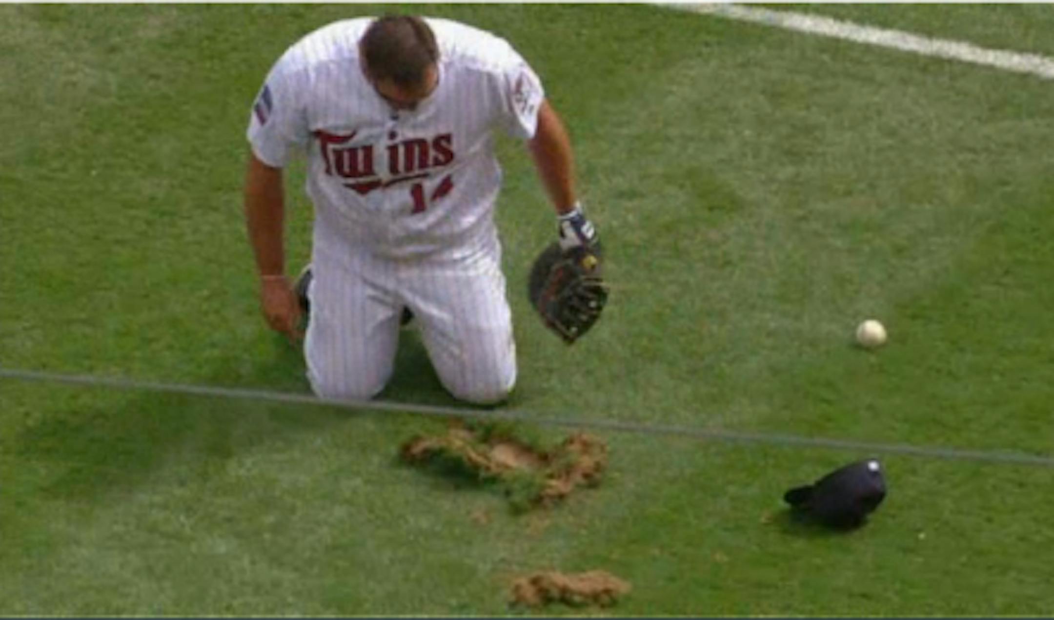 In case you missed it, there's a screen grab from Kent Hrbek's divot-creating stumble-dive Sunday at the Twins' Legends Game. And here is the full video. Last time we saw a chunk of earth come up like that, Rocket was trying to hit a 7-iron with his eyes closed. There's a Ron Gant joke in there somewhere after we're done choking back the tears.