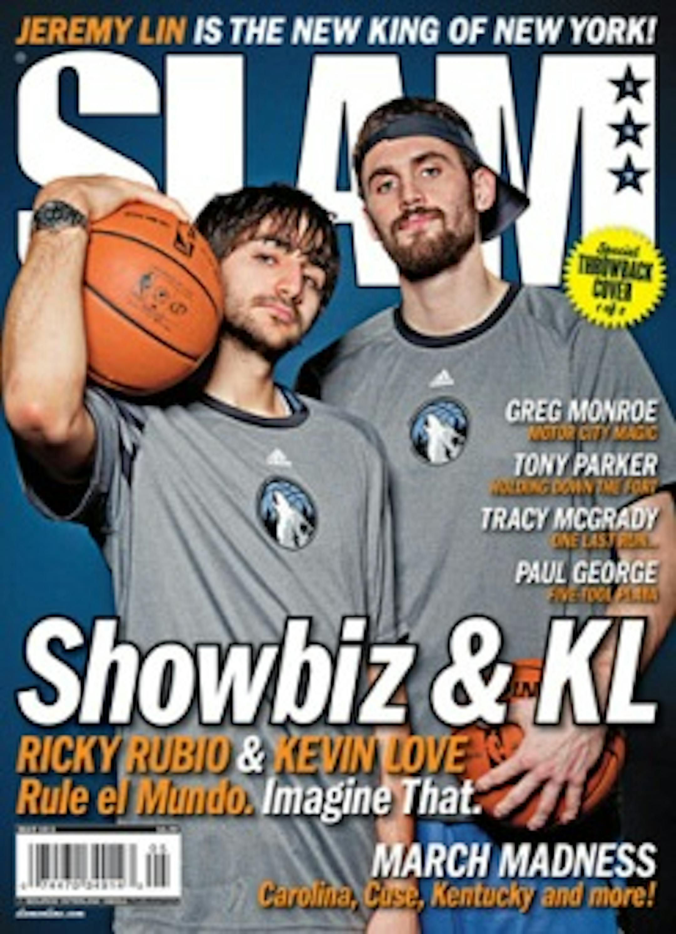 The Timberwolves are front and center in the latest edition of SLAM Magazine, which hit news stands today. Wolves All-Star forward Kevin Love and rookie guard Ricky Rubio paired together at the Life Time Training Center to do a photo shoot with SLAM, and they are posing on the cover reminiscent to the way Kevin Garnett and Stephon Marbury did in the 1997-98 season. Love, wearing a backwards visor and Rubio, holding a ball over his right shoulder, are paired the same way Garnett and Marbury posed more than a decade ago.