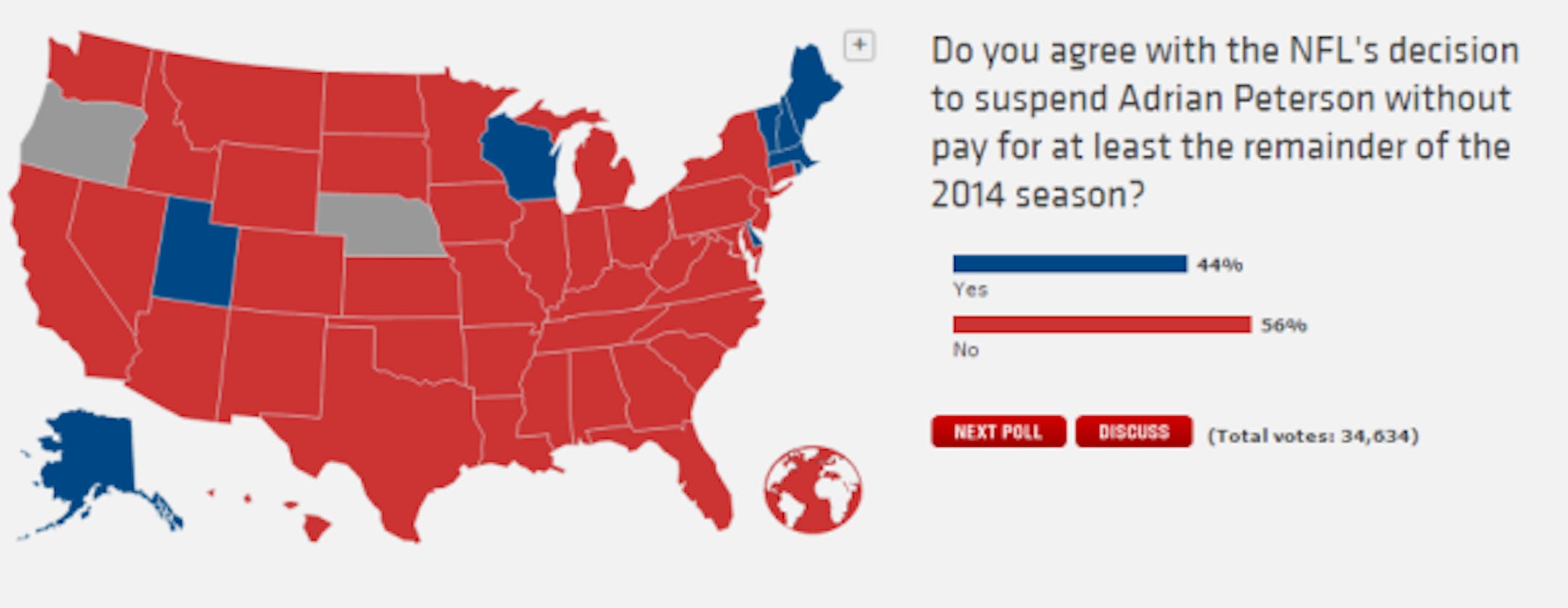 ESPN's SportsNation poll breaks down how voters in each state feel about the punishment levied by the NFL against Adrian Peterson. Voters overall — and in most states, including Minnesota — said they don't agree with it.