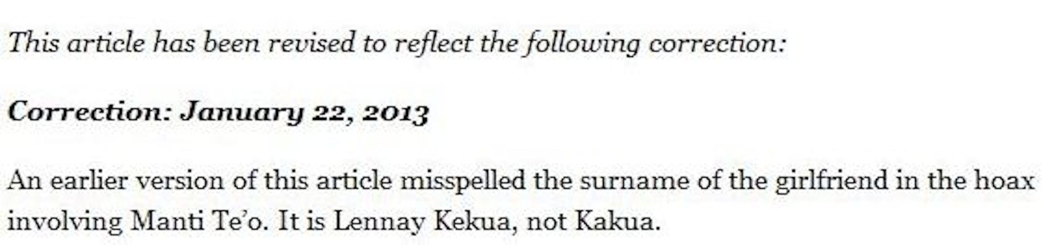 TFD: New York Times runs correction for misspelling name of Manti Te'o's fake girlfriend
