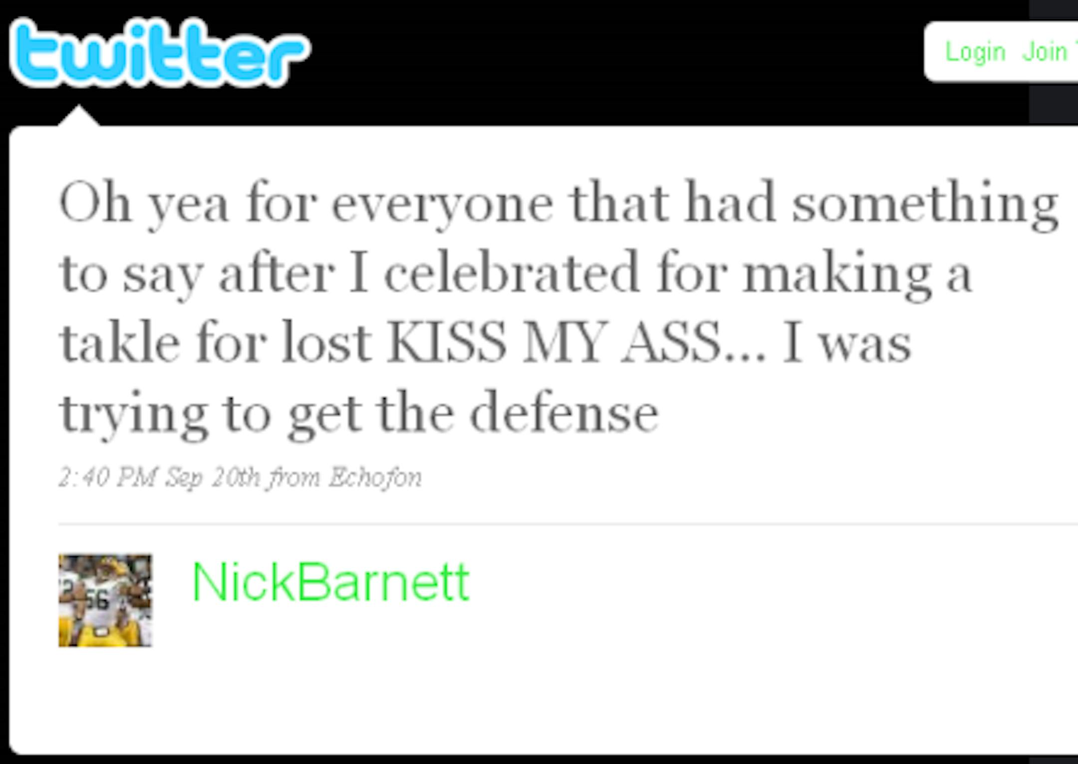 We first noticed Nick Barnett's choicest tweet last night (yeah, we were combing through Packers coverage. We do that when they lose. We're not proud, but we're not denying it). Apparently, the only way for a cooler head to prevail and for fans to not feel this linebacker's wrath is for Nick to stay off Twitter until the offseason. His last three posts, presumably until a few minutes after the final game of the regular season (see what we did there?!) (sic):