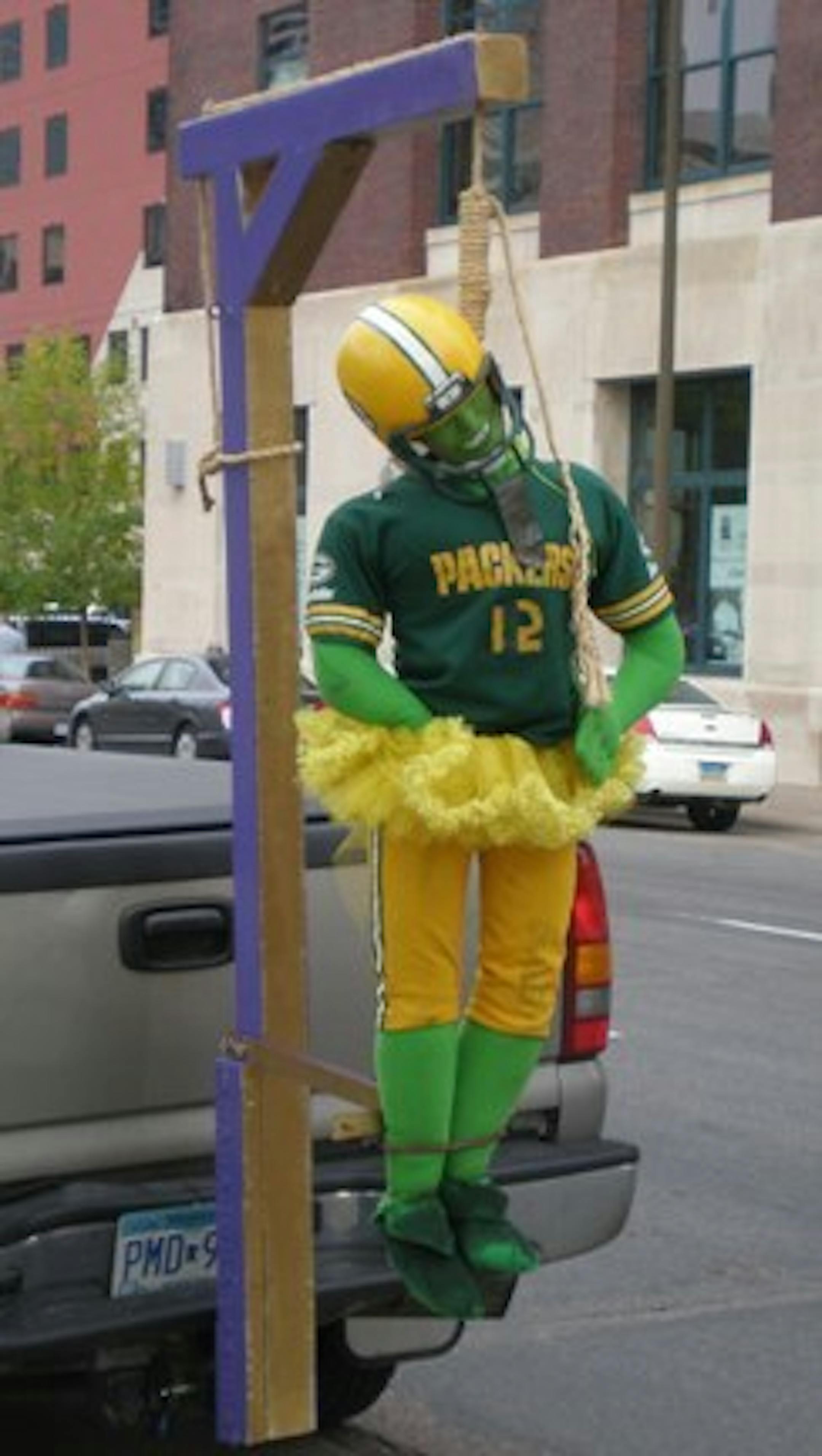 That classy little effigy -- hanging from a hand-painted purple gallows, no less! -- was attached to a truck on a street at noon today not too far from both the Metrodome and the Star Tribune. Notice the tutu. Rodney Harrison would be proud.