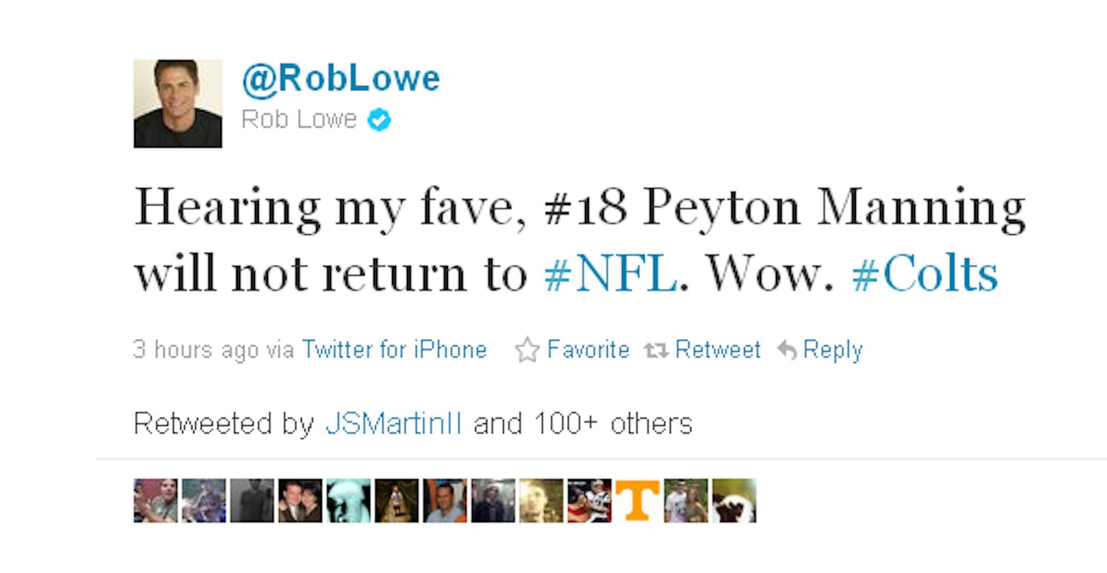 On the day Wikipedia went dark (unless, you know, you just hit the escape key when you were trying to load the page you wanted), actor Rob Lowe lit up as a possible NFL insider. Like a Brat Packed-out Jay Glazer, Lowe tweeted that he was hearing Peyton Manning was retiring.