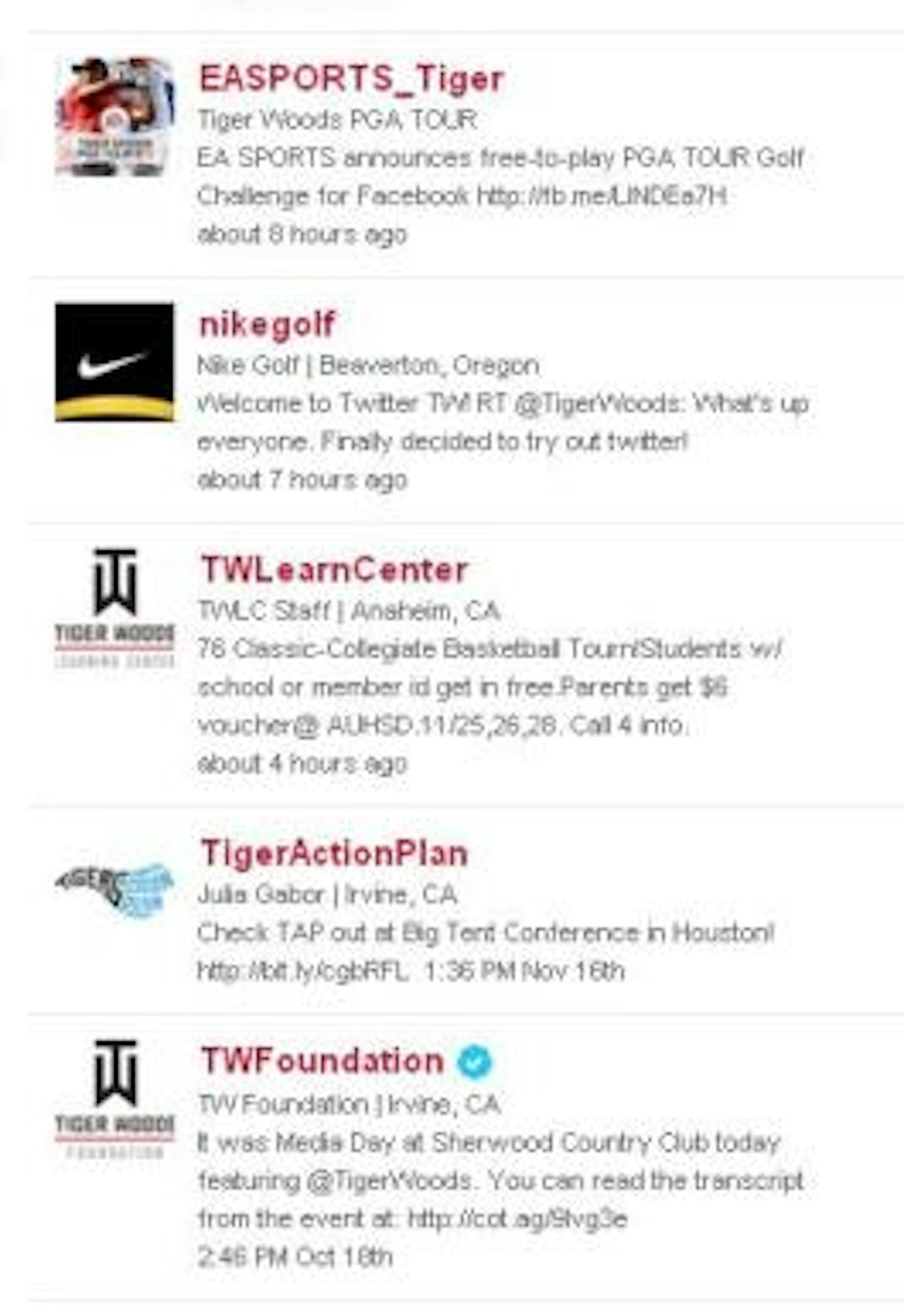 Commenter Newbie astutely points out that not only did Tiger Woods actively join the Twitter world (155K followers and counting, as of 4:55 p.m.), but he is following exactly 7 other accounts: Stanford athletics, fellow golfer Notah Begay and ... five accounts having to do with Tiger Woods and/or his sponsors.