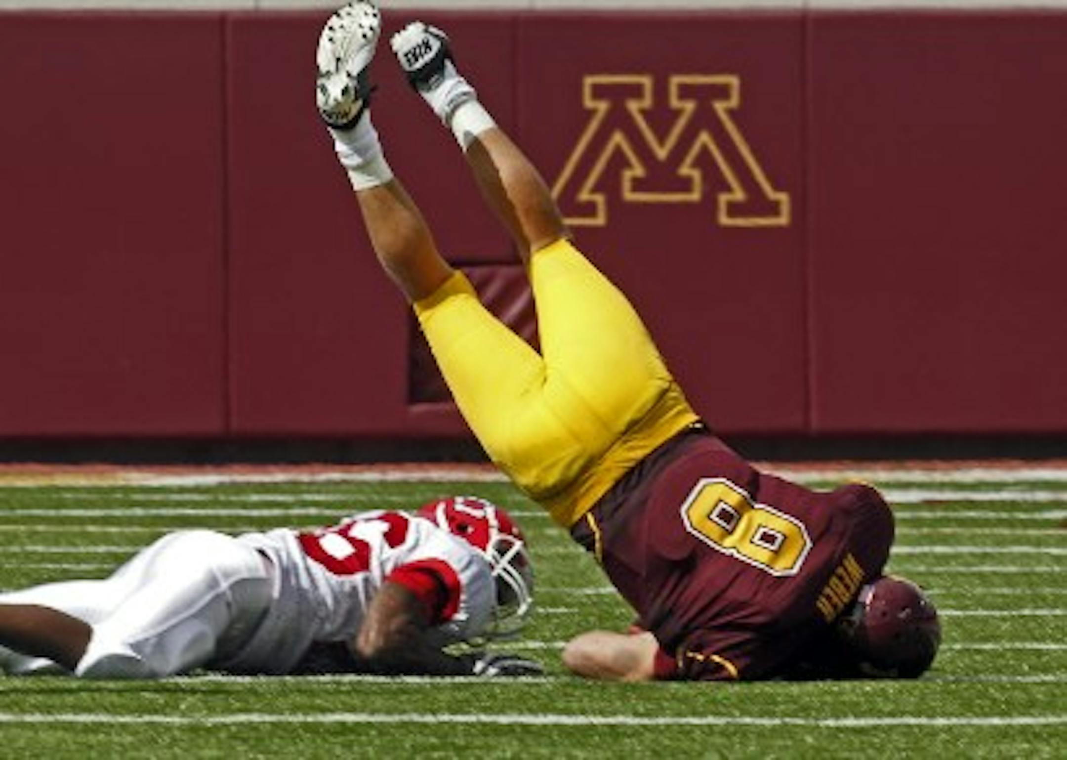 That picture might be a reasonable representation of your memory of Saturday's Gophers/South Dakota game. Metaphorically speaking, the Gophers fell flat on their faces.