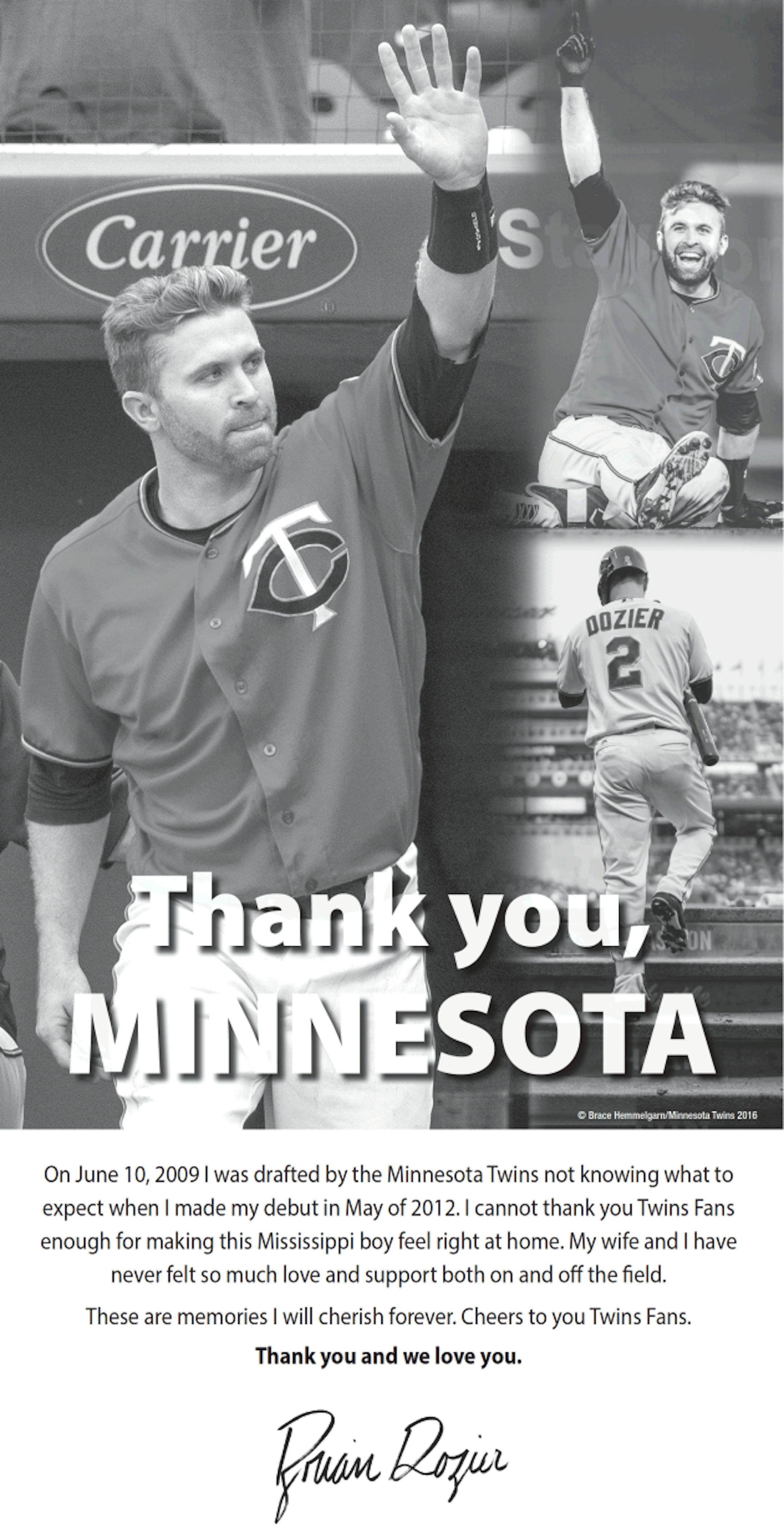 And he batted 1.000 in the good-bye department with Twins fans by taking out this ad, which is in the print edition of Thursday's Star Tribune.