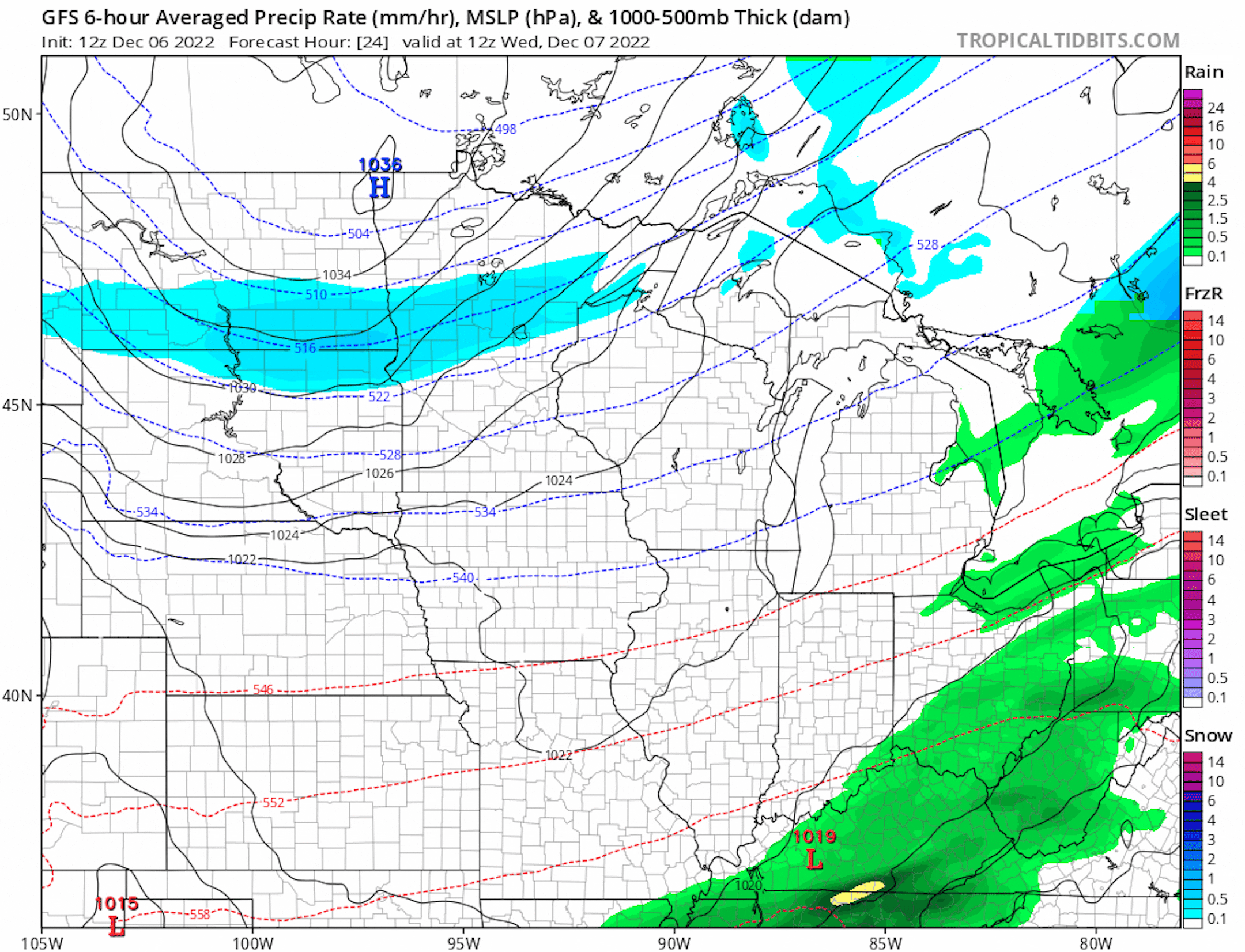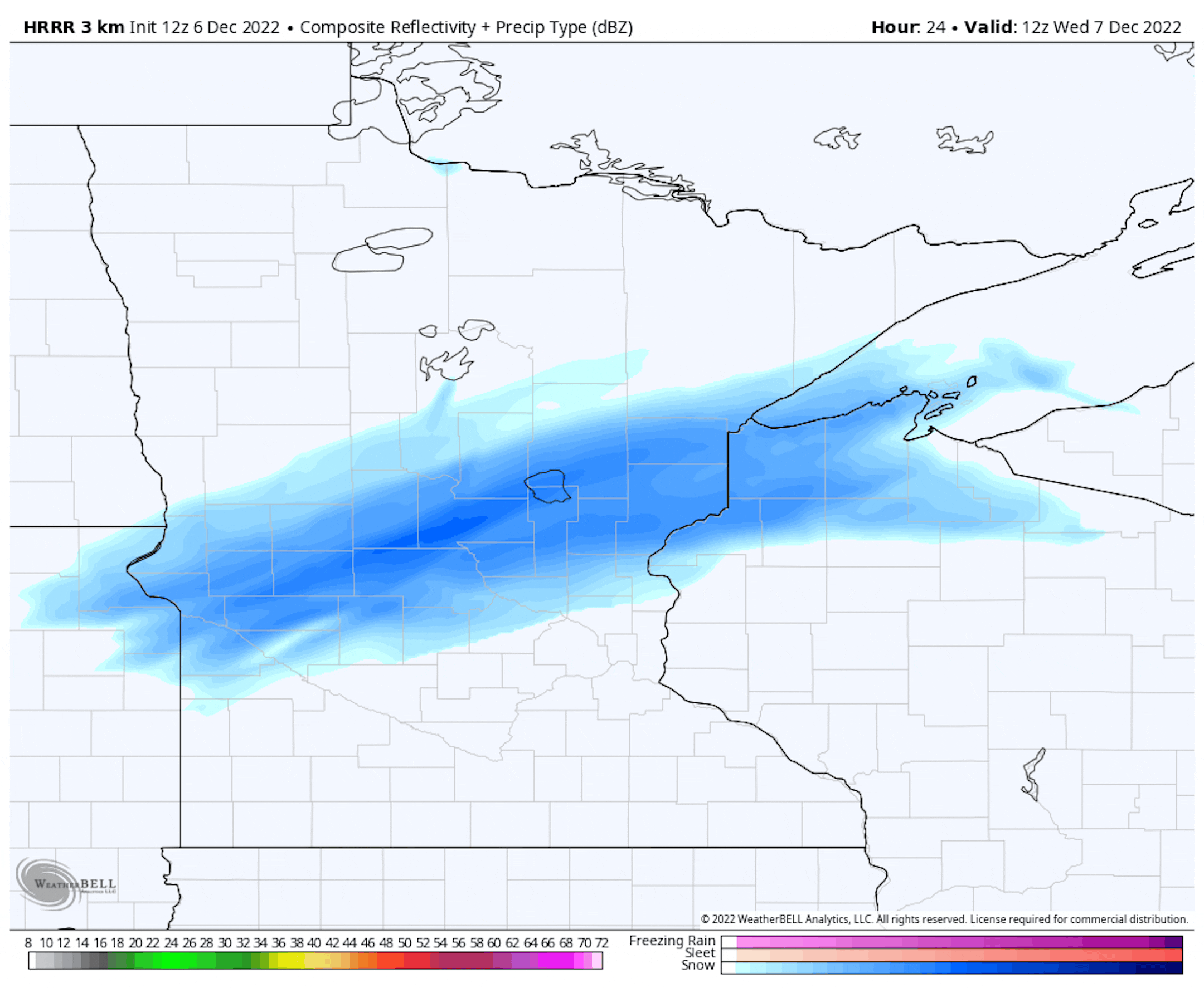 The simulated radar through on Wednesday shows a fairly small blip of snow working through the Central part of Minnesota and into northern Wisconsin. The Twin Cities could get clipped, but a few flakes/flurries, but the best chance of any minor accumulations will be north of the Twin Cities.