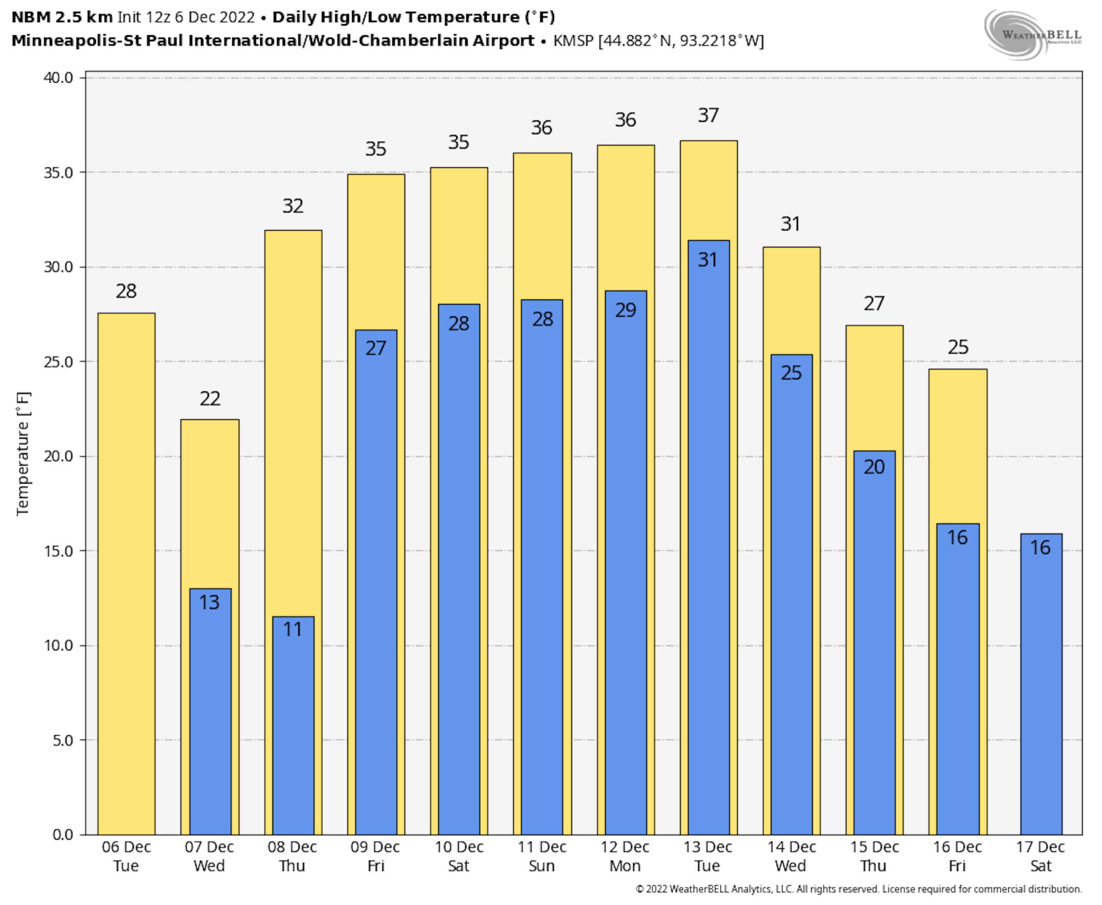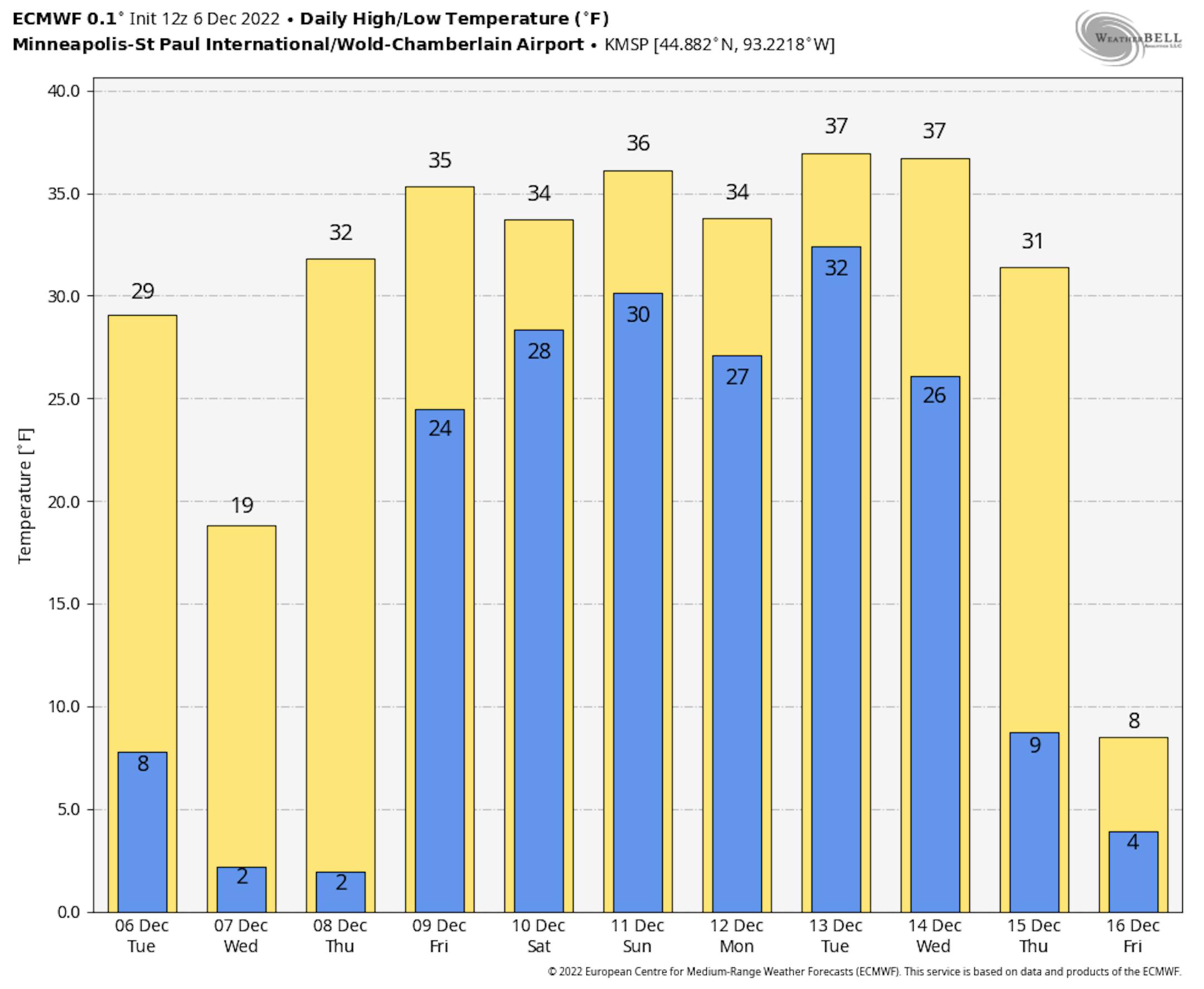 The extended temperature outlook for Minneapolis through mid month shows milder temperatures returning as we approach the end of the week/weekend with highs back in the mid/upper 30s. Readings could take a bit of a hit once again as we approach the 3rd weekend of the month. Stay tuned...