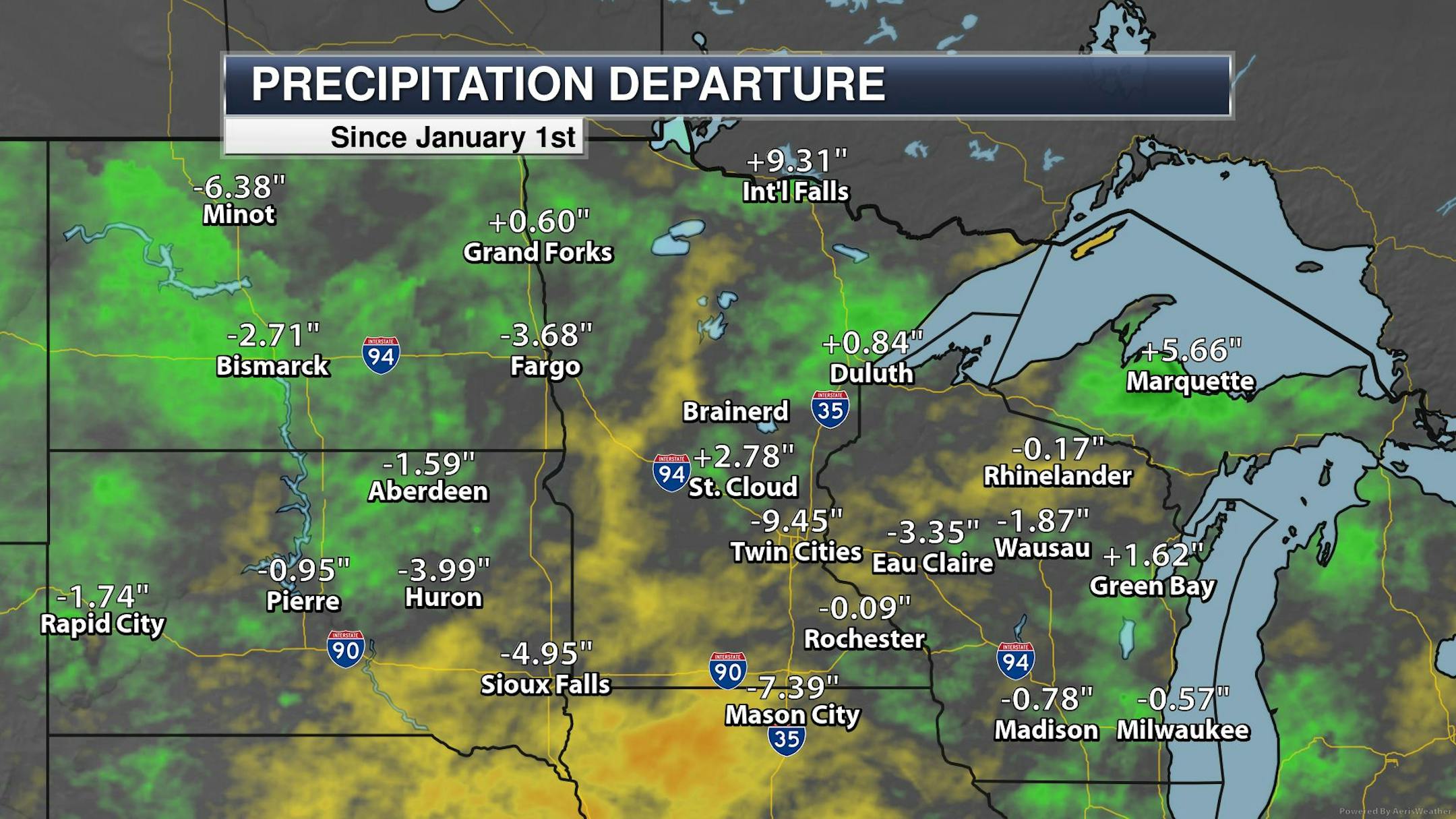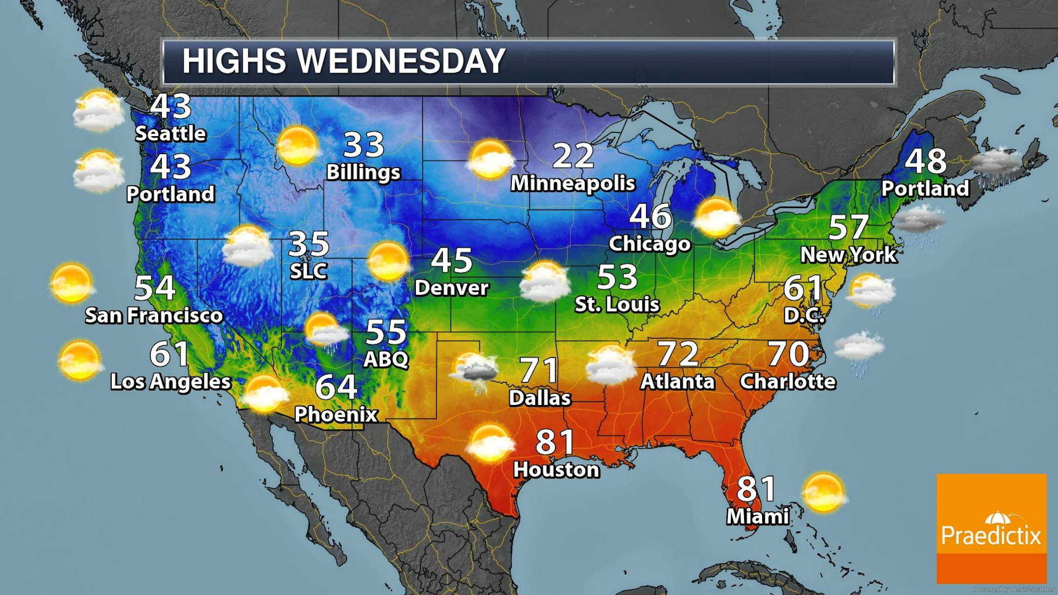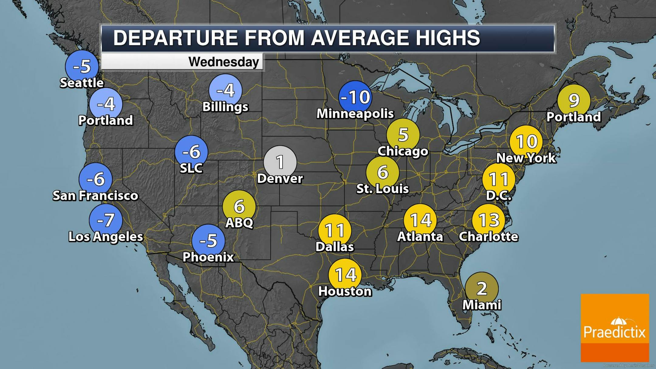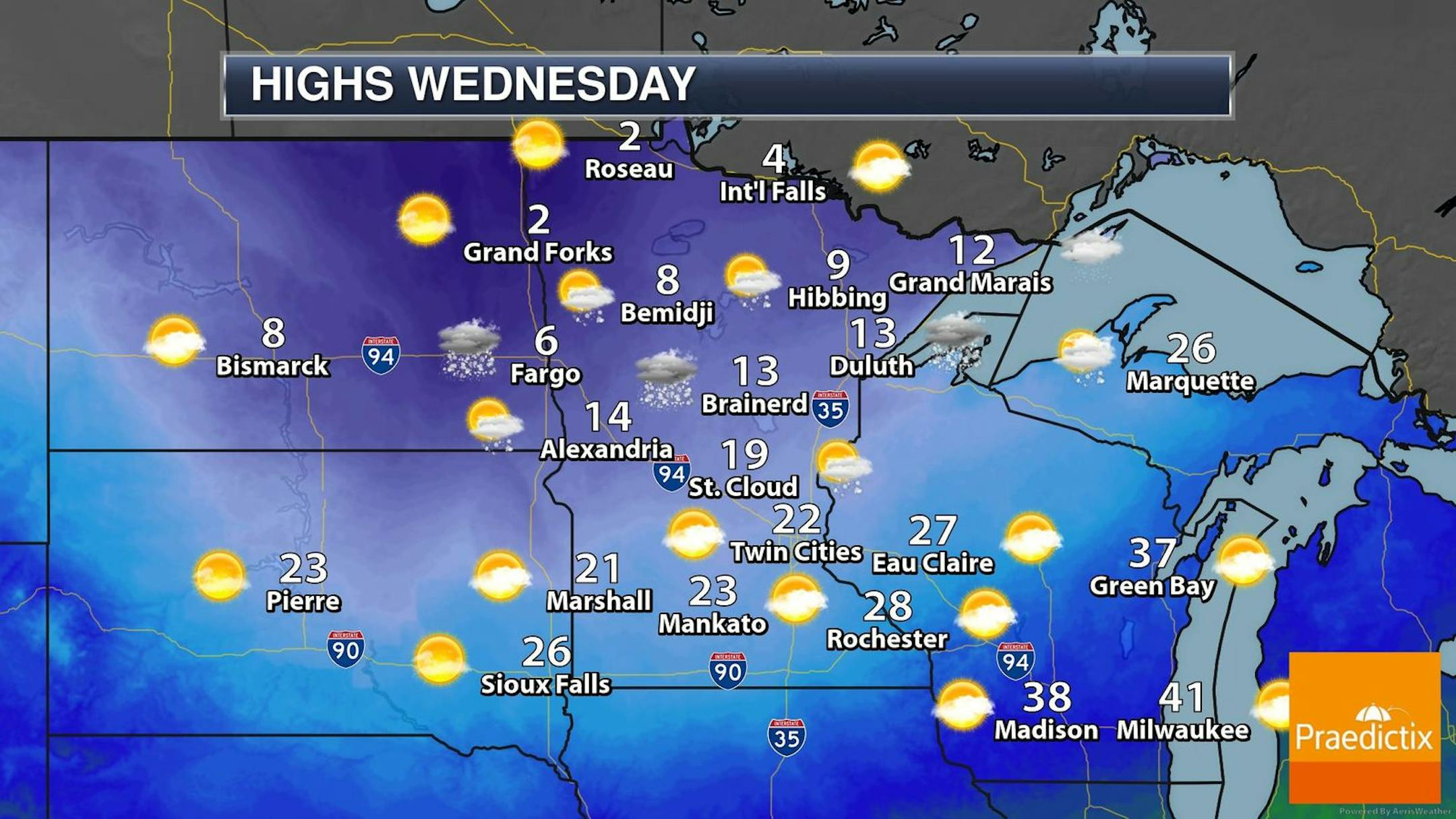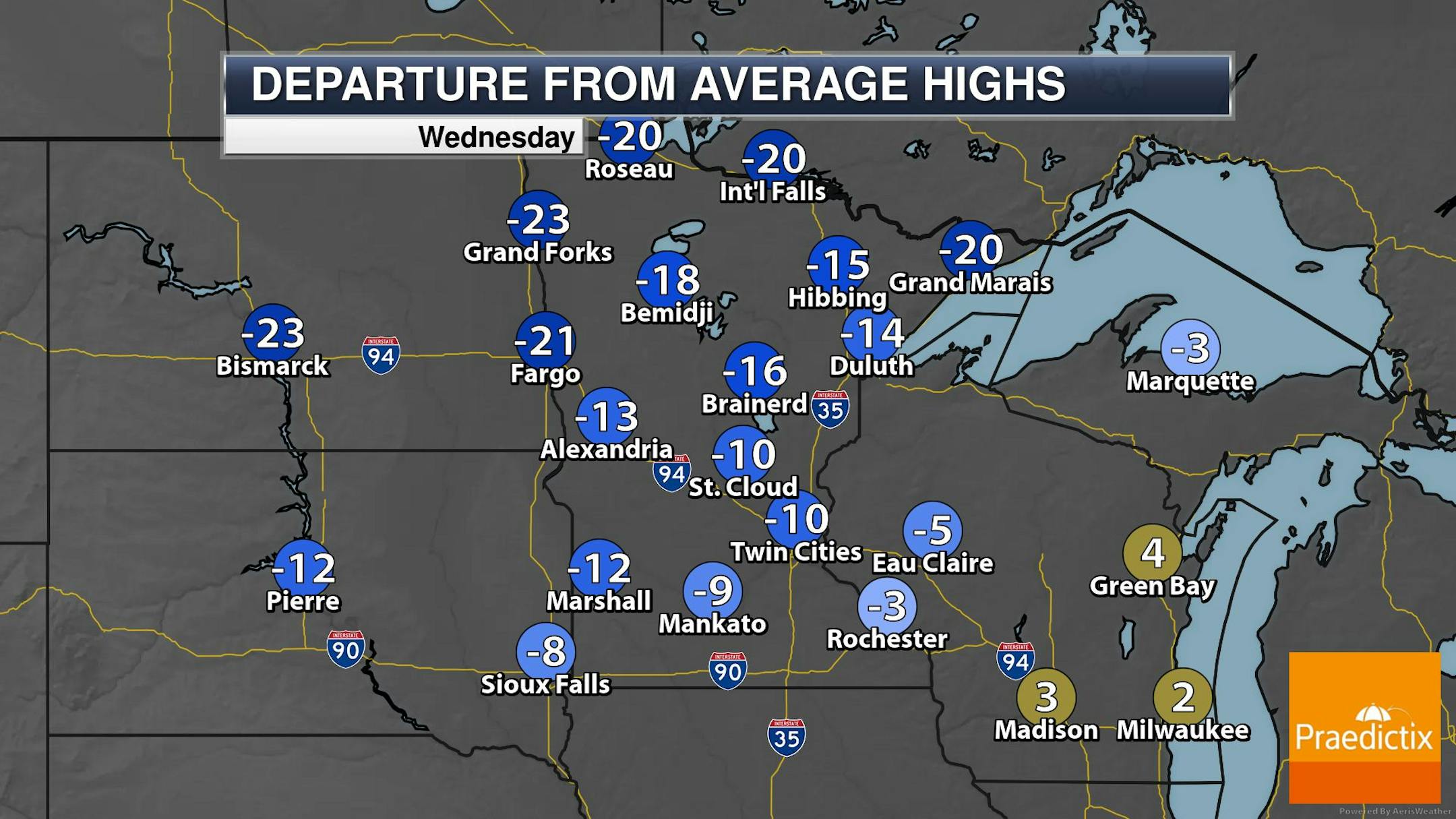 Temps across the region on Wednesday will be cooler than average by nearly -10F to -20F with some spots across the international border having a hard time warming above the 0F mark. There will also be areas of snow across the northern half of the state with minor accumulations possible.