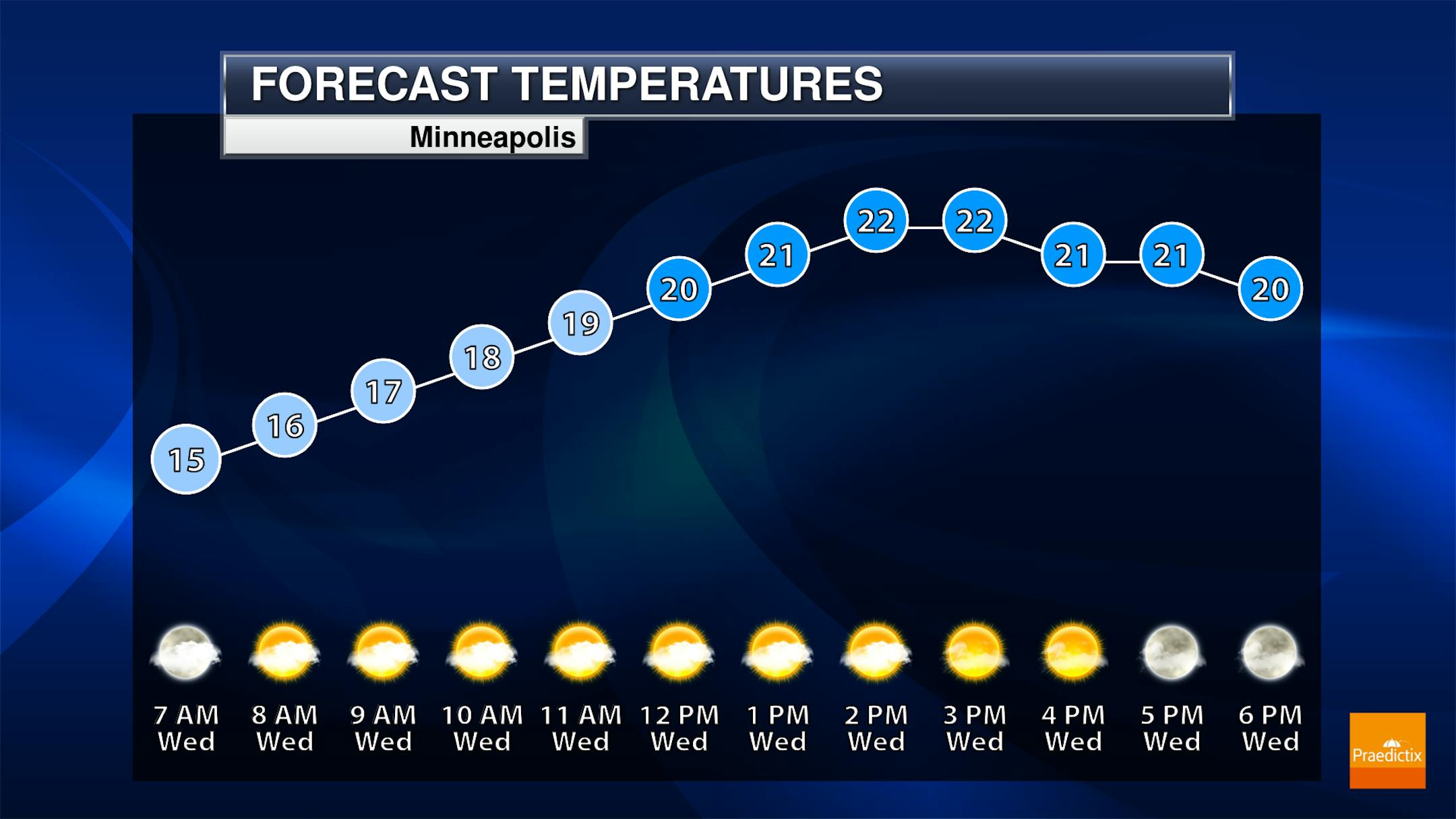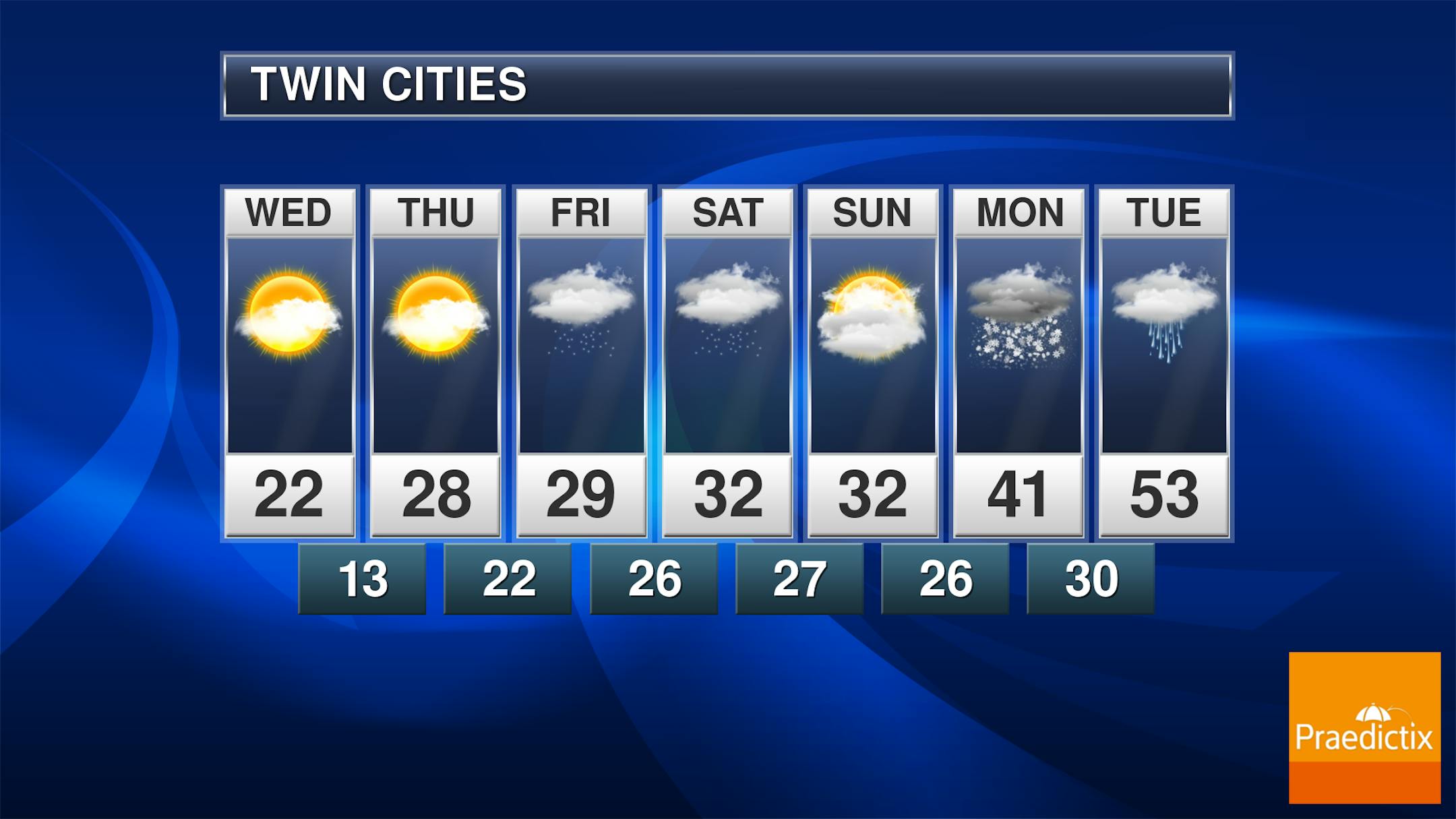 Here's the weather outlook for the Twin Cities on Wednesday, December 7th, which looks fairly chilly with temps only warming into the low/mid 20s. There will be a cloudier skies and perhaps a few flakes in the morning, but skies should turn sunnier through the afternoon.