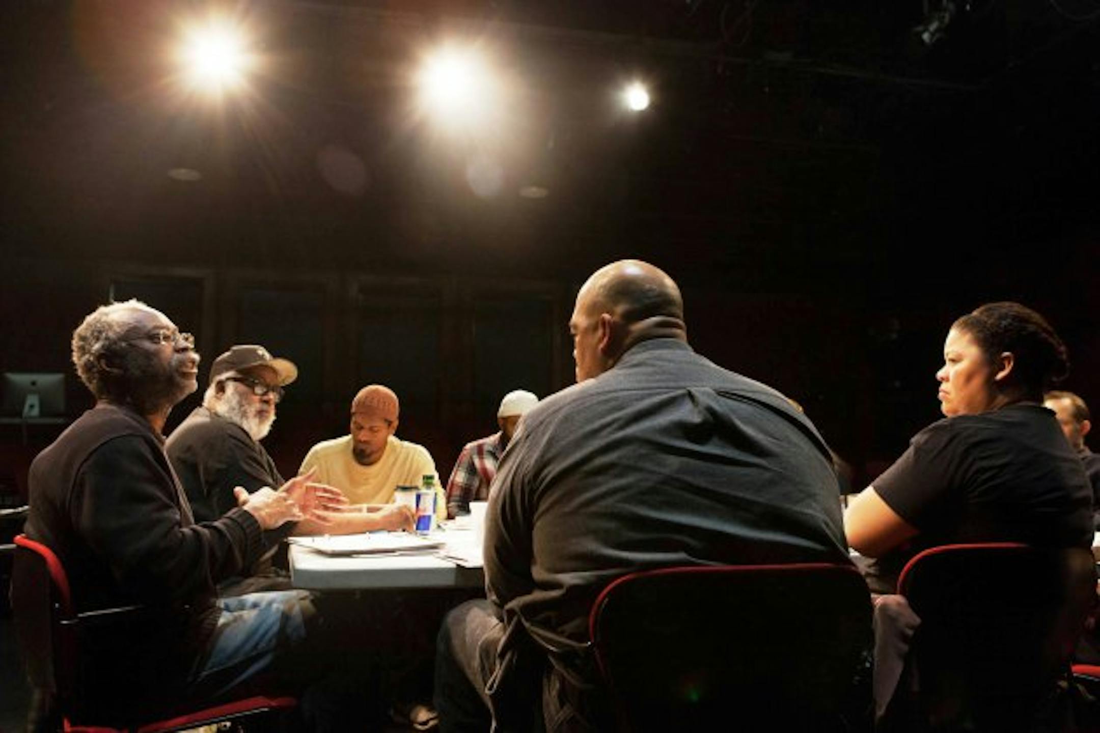 Playwright Carlyle Brown, left, director Marion McClinton, and others discuss Brown's play before PlayLabs. Photo by Heidi Bohnenkamp.