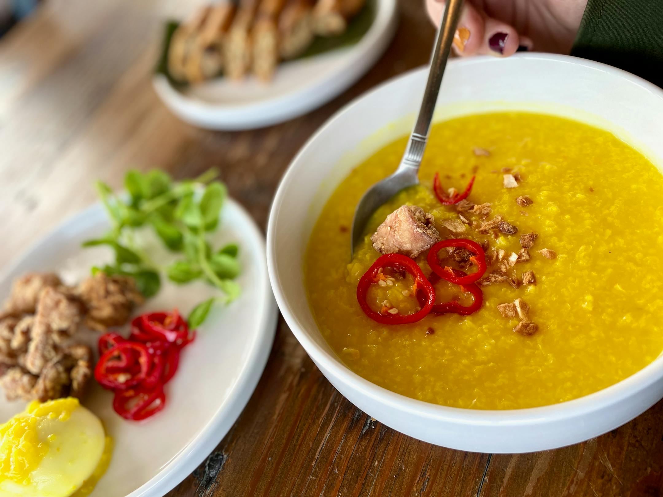 At Kalsada, this dish is a take on Filipino arroz caldo ($13). A downright hot bowl brims with soft-cooked rice porridge the color of the sun we've been missing for so long. Garnished with crispy bits of fried garlic, the dish also comes with a plate of mixing buddies. Nubs of fried chicken add texture and a little saltiness, Fresno chilies amp up the spice and pea shoots add a lovely green crunch. However, it's the egg that really takes this dish over the top into the new favorite breakfast category. Expertly soft boiled, it opens to ooze just a little bit into the golden mixture.
