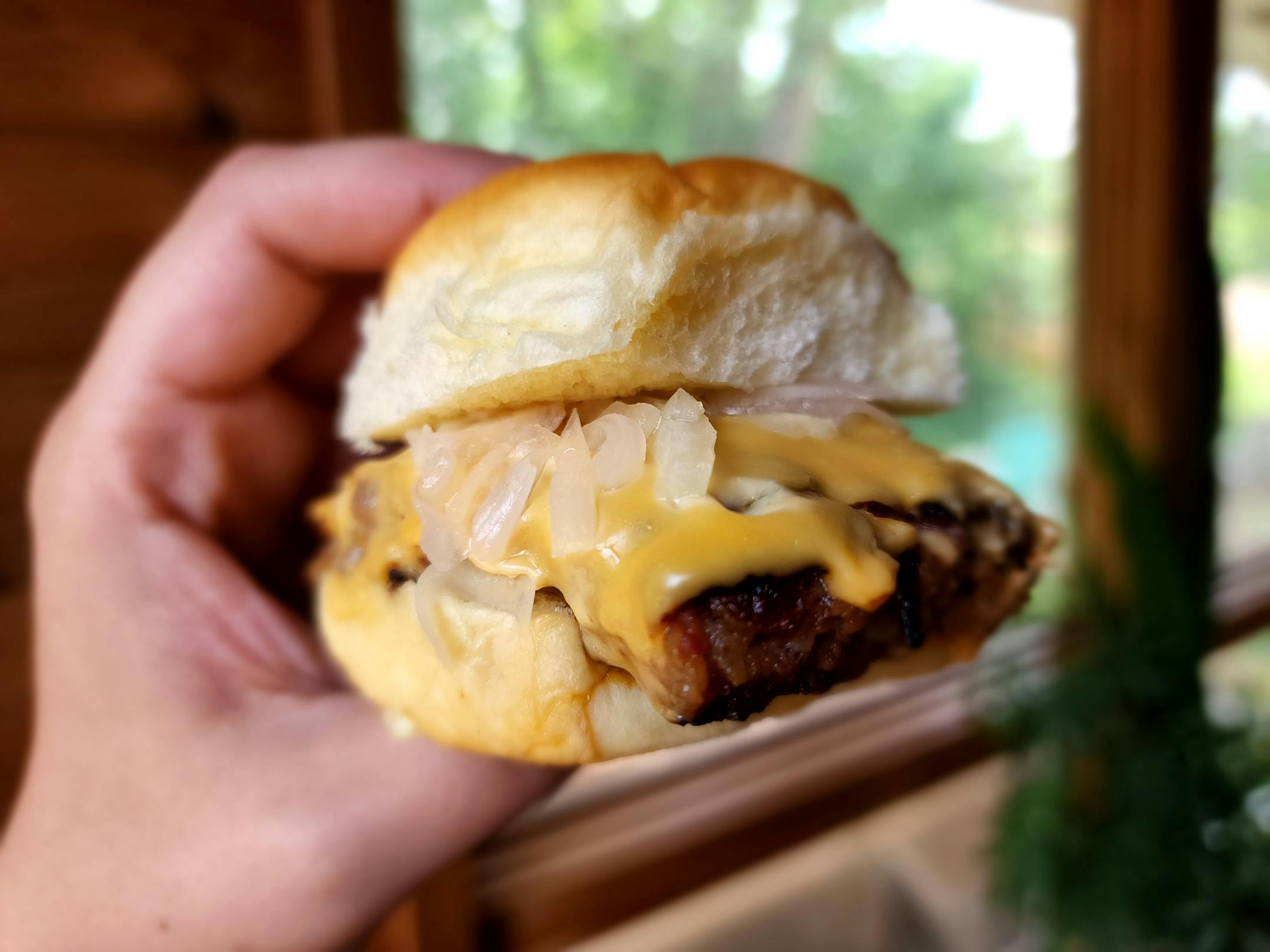 It's a spin on one of his new dumpling flavors, là cháng sausage. The cured Chinese sausage, traditionally eaten in winter months, is a blend of pork, five spice, sugar and baijiu sorghum liquor. To make the dumpling filling, Bian grinds the air-dried là cháng and adds it to ground pork shoulder, housemade chicken stock, white onions, white pepper, light and dark soy and oyster sauce. Last week, he also formed the mix into patties, topped them with melty American cheese and crunchy onions and served them on a King's Hawaiian roll for a $5 blast of sweet-and-savory goodness.