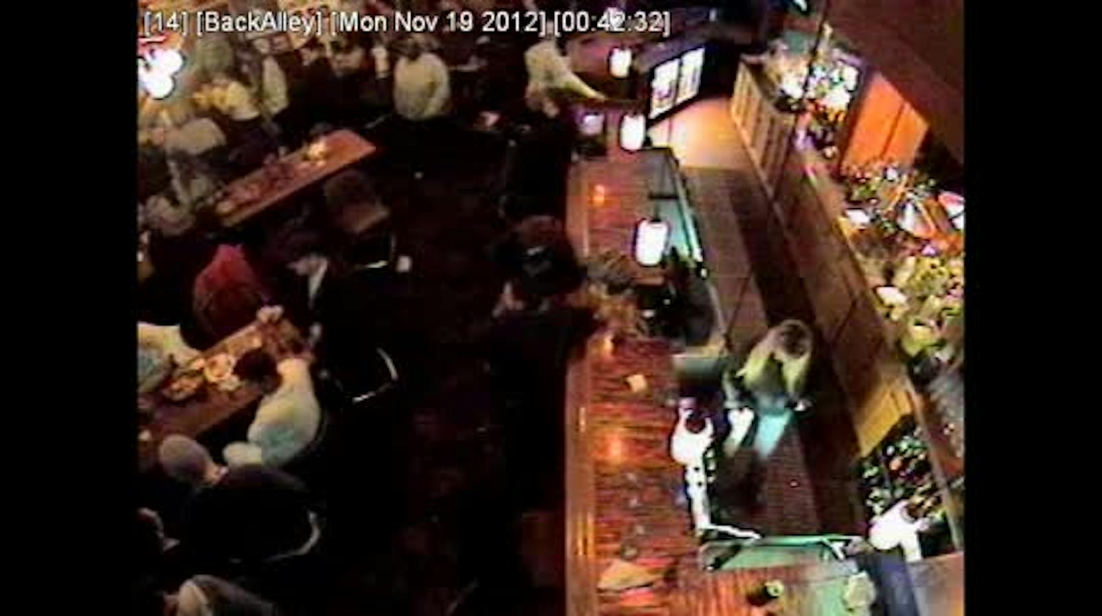 Shot by two cameras at the Apple Valley bar Bogart's Place, one inside and another outside the bar, the time-stamped videos start at about 12:42 a.m. The videos are silent because the security cameras do not record sound.