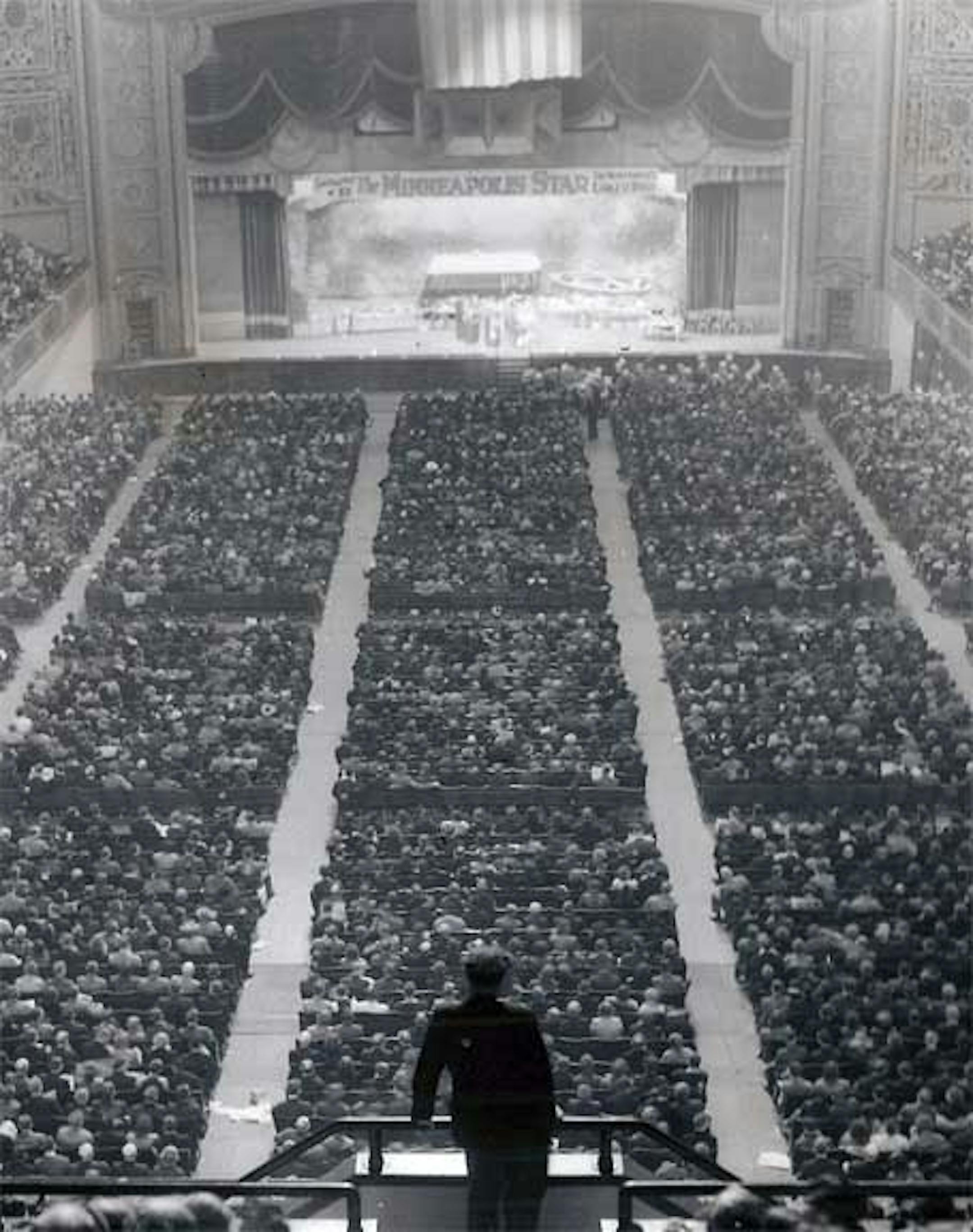 The interior: there are many shots of the place jam-packed; this one omits the bleachers, but gives you a feel for the scale. It's a "Hunting and Fishing Show" - no exhibits, it seems, just lots of people watching strange pageants on stage. Brought to you by the Star!