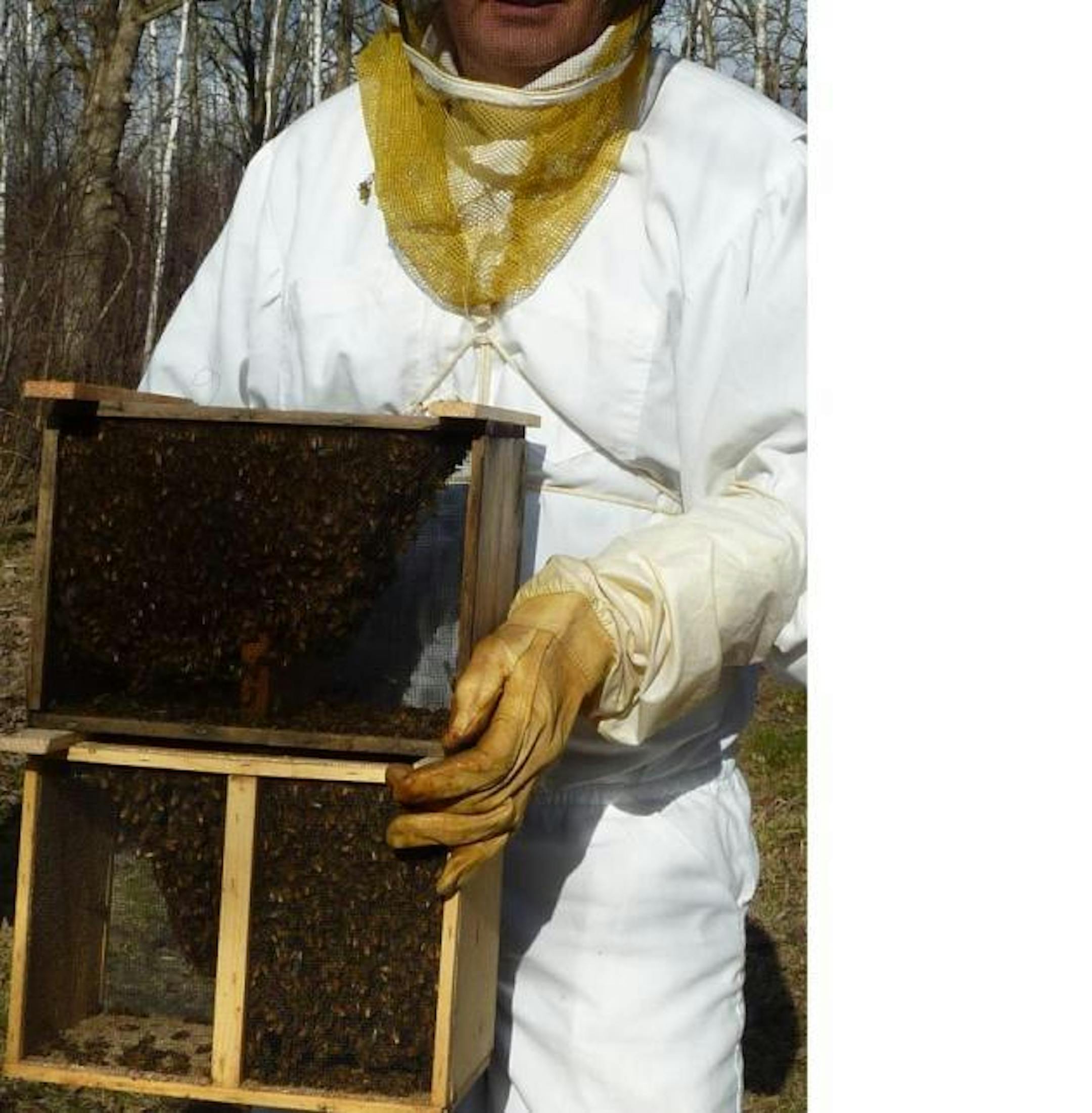 The photo on the right is my husband holding two packages of bees. There are about two thousand bees and one queen in each package. After you dump them into the hive, it's important to feed them sugar water and artificial pollen so they can build up the size of the hive. Beekeepers continue to feed their bees each week until the dandelion bloom.