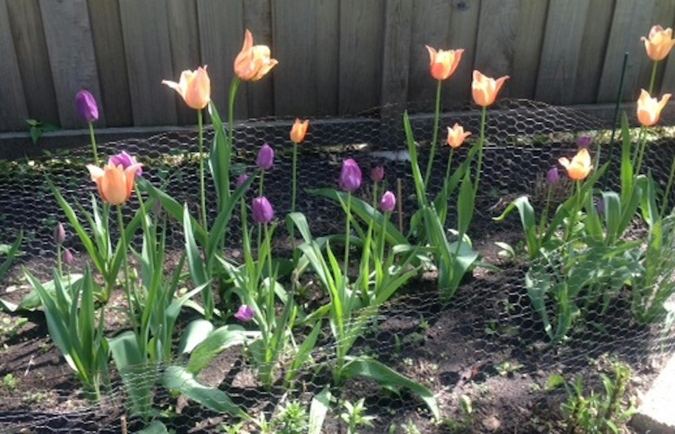 So I chose two varieties of tall tulips, one orange, the other purple. In the photos, the blooms were a fiery orange and a deep silky purple that verged on black. They were supposed to bloom at the same time. What a show that would be!