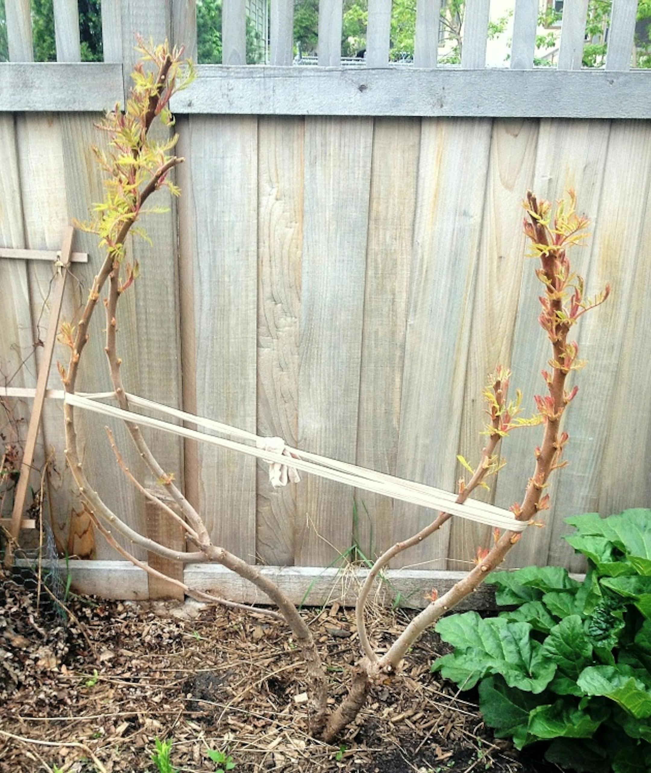 One my favorite tips is to use old nylon hose to tie up tomatoes, clematis and even this unruly "Tiger Eyes" sumac. Nylons are strong, soft and stretchy and don't cut into tender branches like twine or other materials. While I usually cut nylons into small pieces for this kind of work, in the case of "Tiger Eyes" I am trying to make the plant grow more upright and pulled the nylon quite tight, leaving the hose leg uncut so the band around the branches is wide and won't damage the branches.