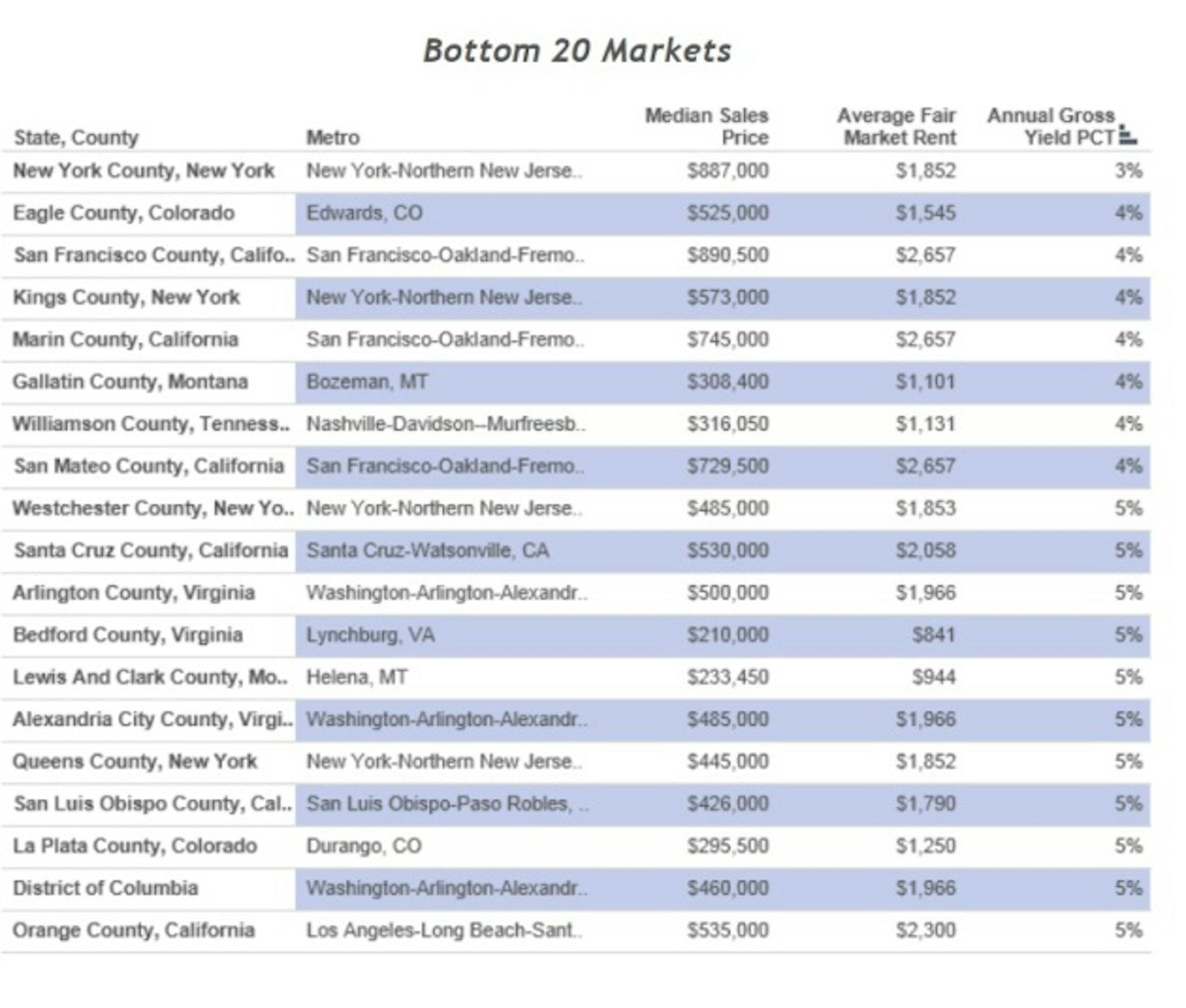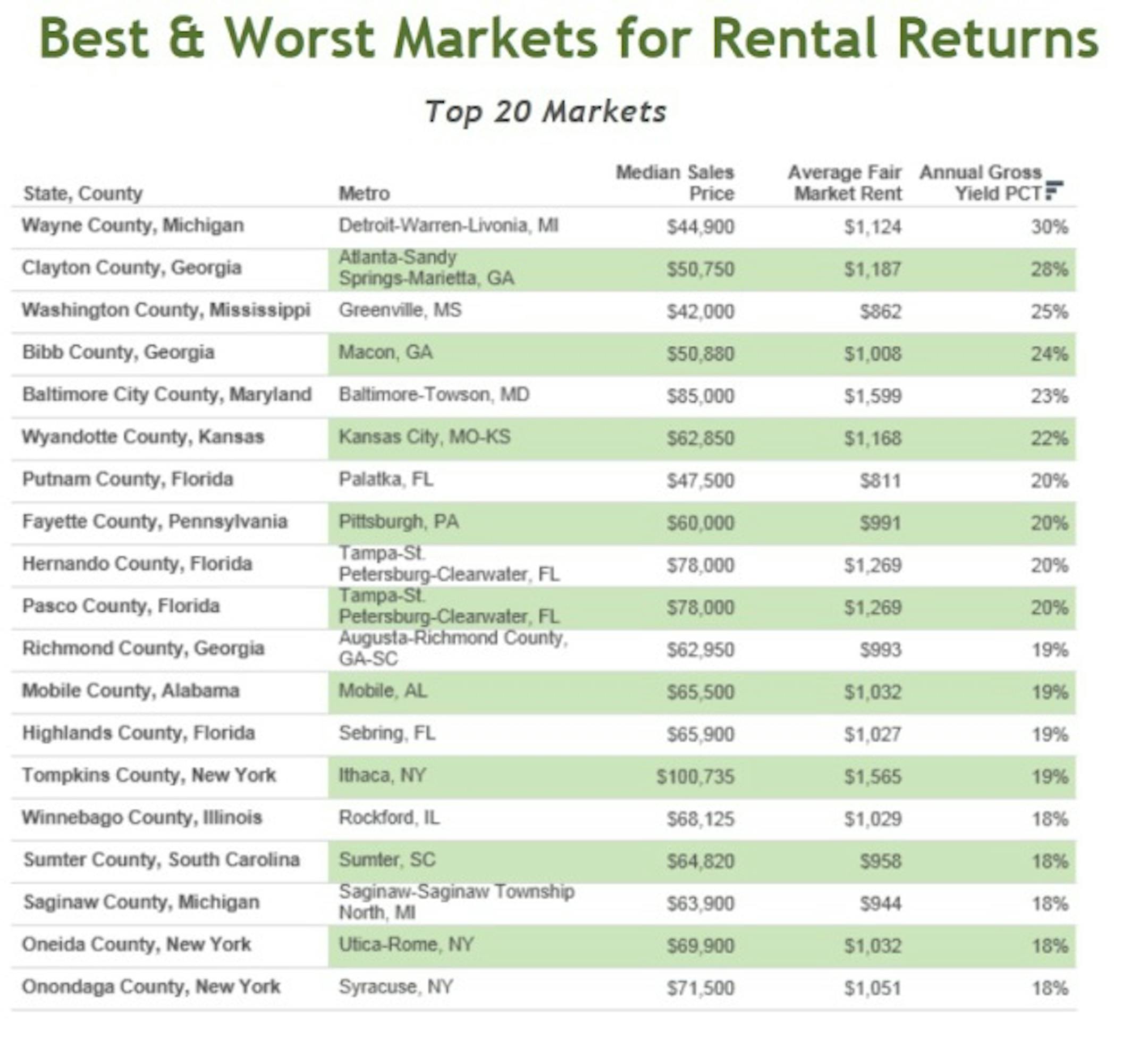 In many parts of the country house prices are rising faster than rents, making it difficult to find investment opportunities that will cash flow. A new analysis by RealtyTrac takes a closer look at where median home prices and average rental rates make for good — and not so good — returns on rental properties. That rental return, by the way, for each county is the gross rental yield, calculated by taking the 2014 fair market rent for a three-bedroom home multiplied by 12 (months) and then dividing that 12-month total by the median sales price of residential properties in the county. Here's what they found: