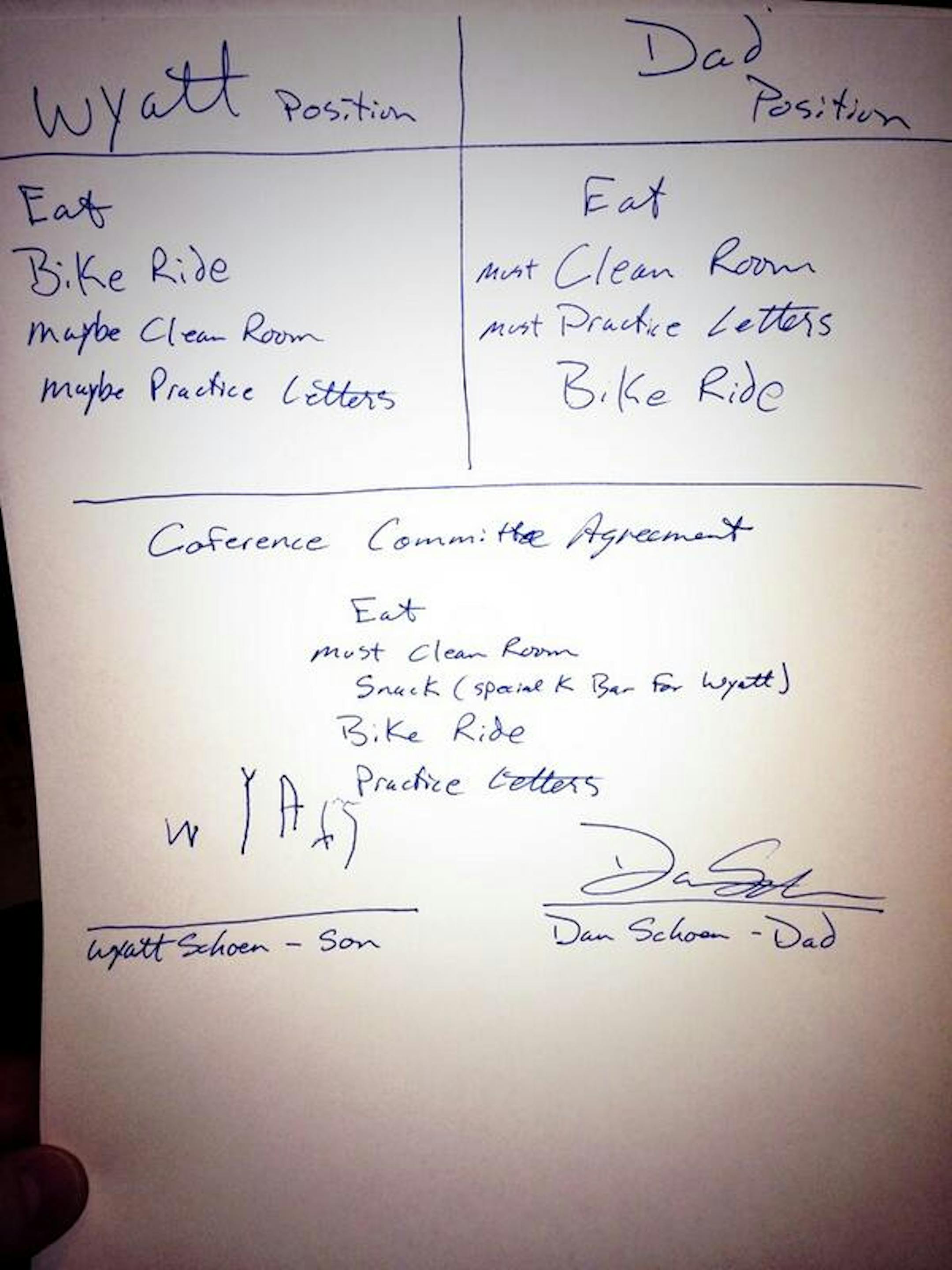 His young son Wyatt was unwilling to accept a mandate to clean his room and practice his letters. Indeed, Wyatt supported riding his bike before entertaining the possibility of room cleaning or letter practicing.