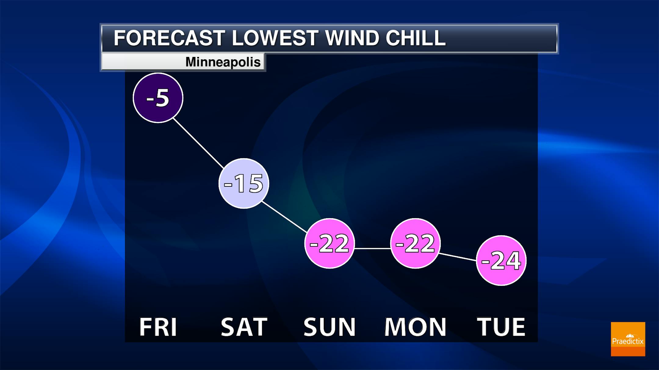 Morning wind chills from Sunday into the middle of next week will be in the -20s, so keep that in mind as the kids head off to the bus stop next week or as you go to church Sunday!