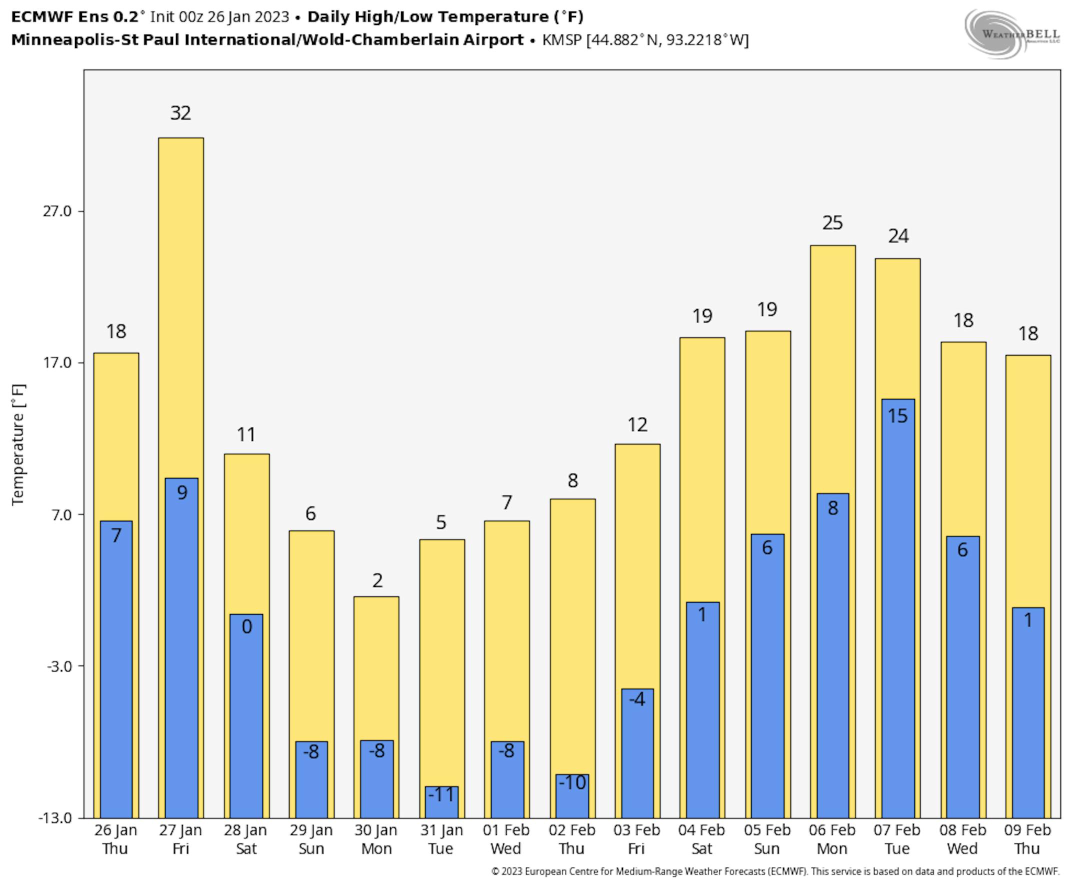 As we head into the weekend, that cold blast of air really settles on into the region for an extended period of time. Highs might be able to make it back to 10F for Hockey Day Minnesota on Saturday in the metro under cloudy skies with snow passing mainly to our south. Clouds continue Sunday with highs only in the mid-single digits. A slight snow chance moves through Sunday Night before sunnier conditions try to move in Monday... but even with that sun, we'll struggle to see highs in the low single digits.