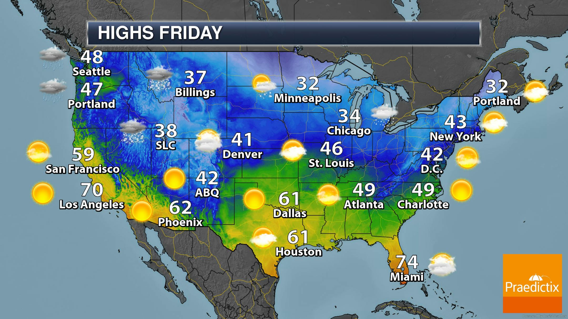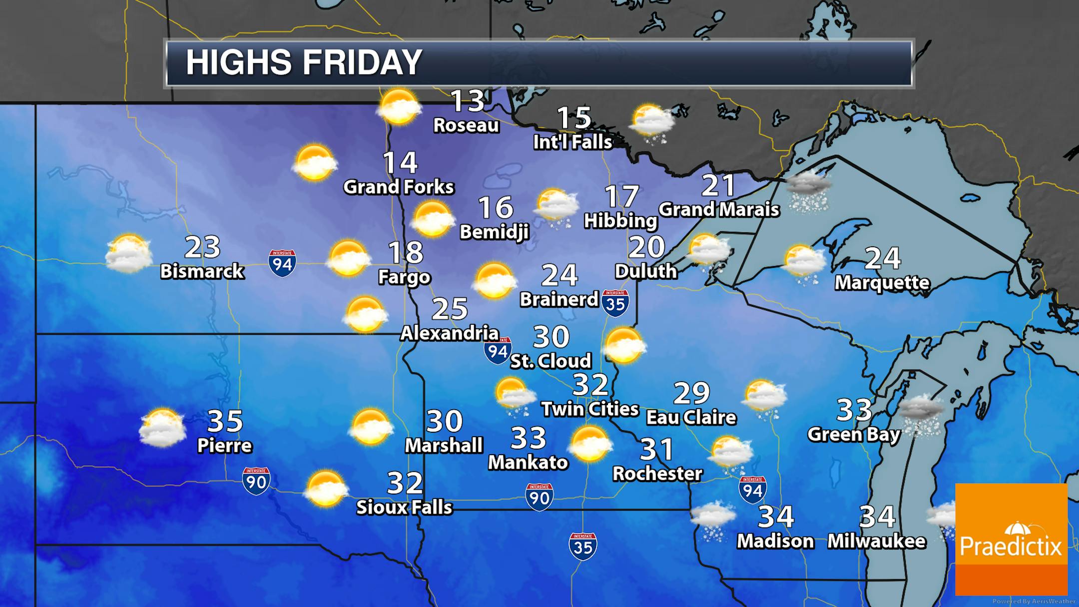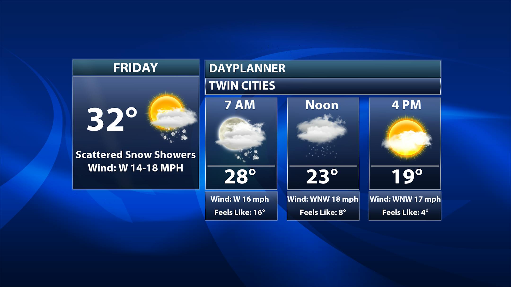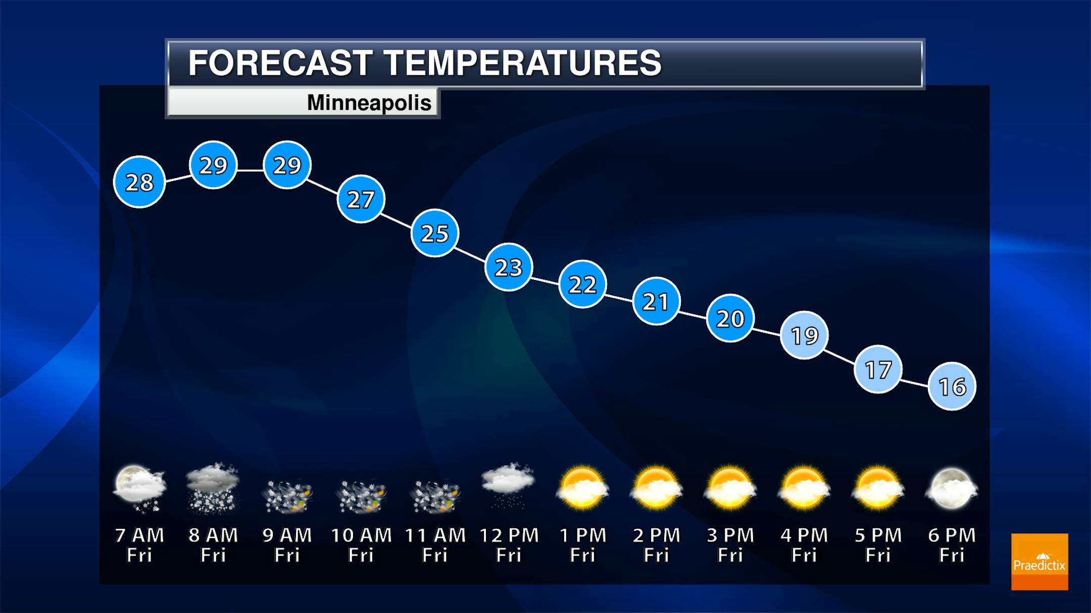Highs across the state will be set early in the day as with the strong northwesterly winds behind the clipper temperatures will be free-falling.