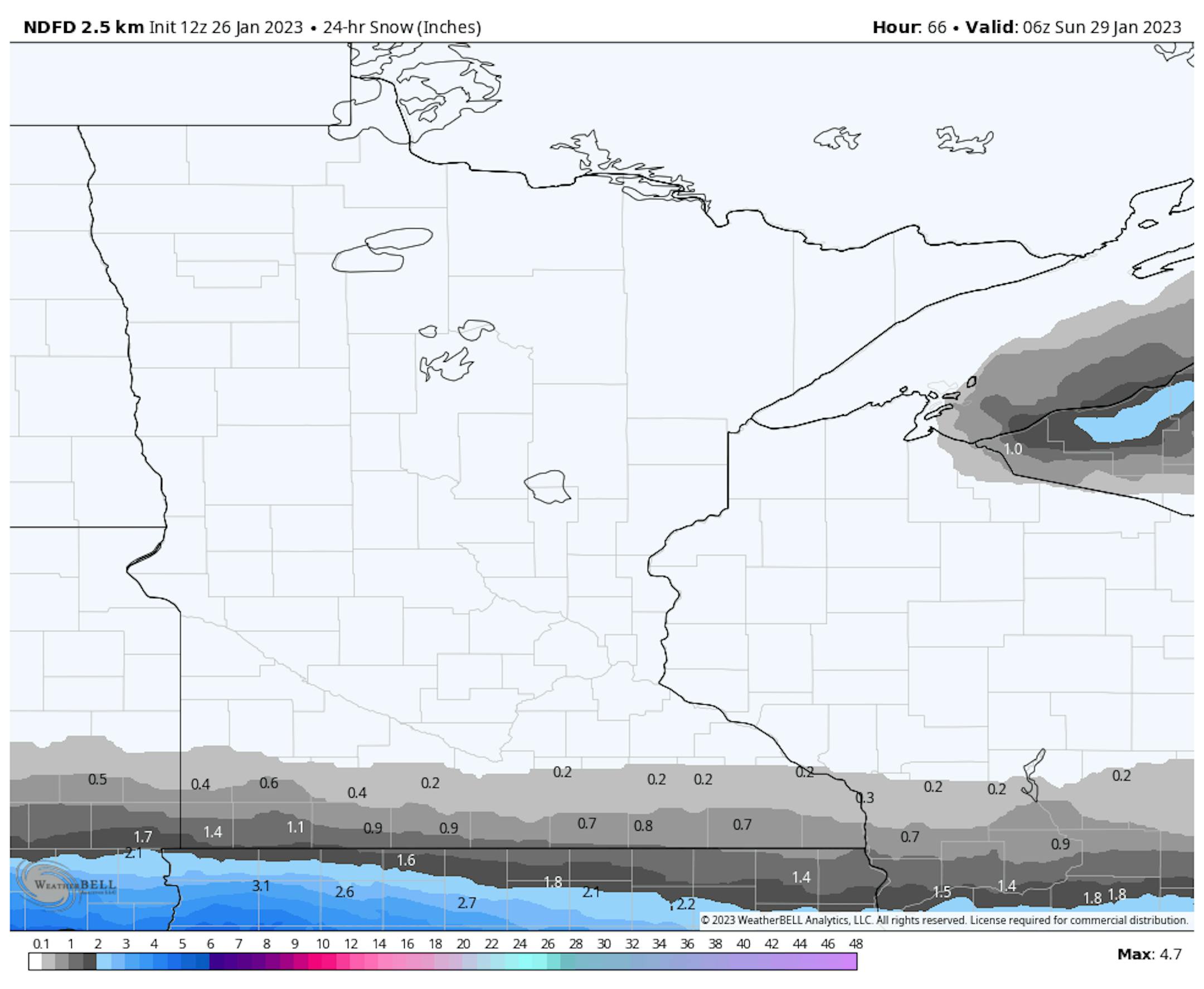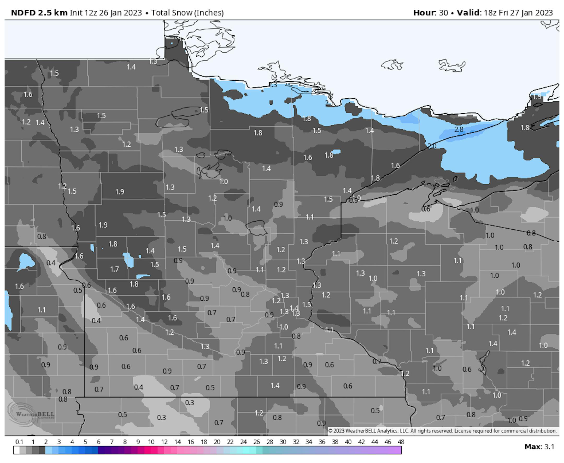 This clipper will bring a widespread 1-2" of snow across much of the state. Some isolated areas - mainly up in the Arrowhead - could see isolated 3" totals.