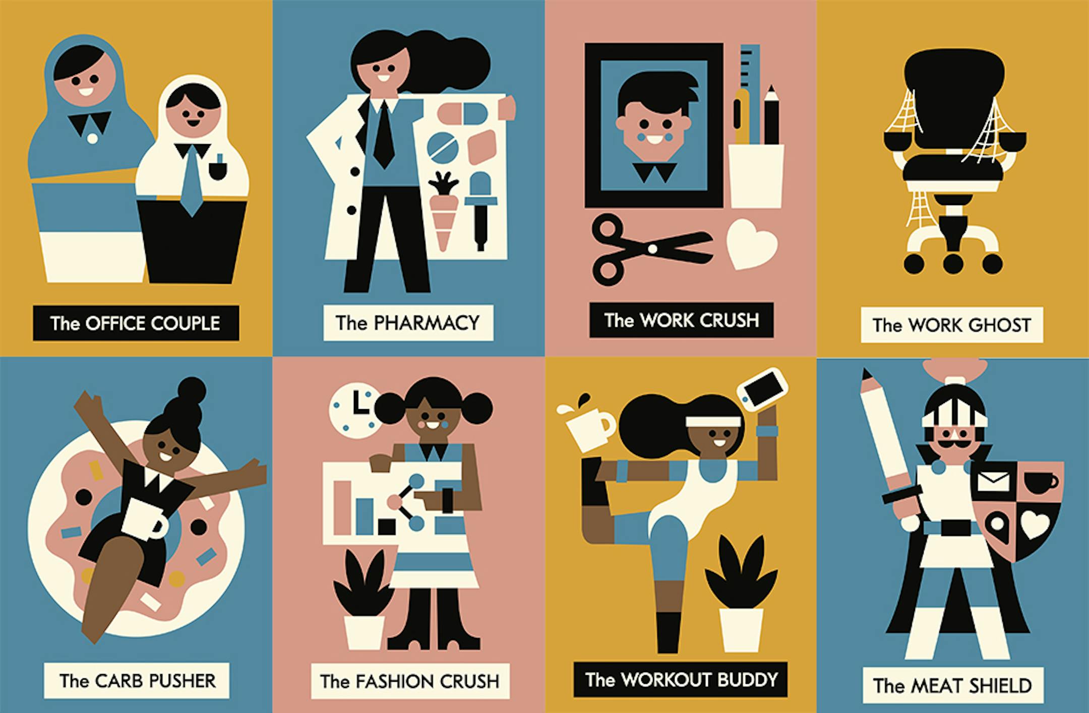 The Office Couple: Every office has at least one of these: that slightly dysfunctional, nonromantic pair who plot their office dominance together. Their ambition is obvious; they finish each other's sentences, and their slightly intense bond tends to creep out everyone else.