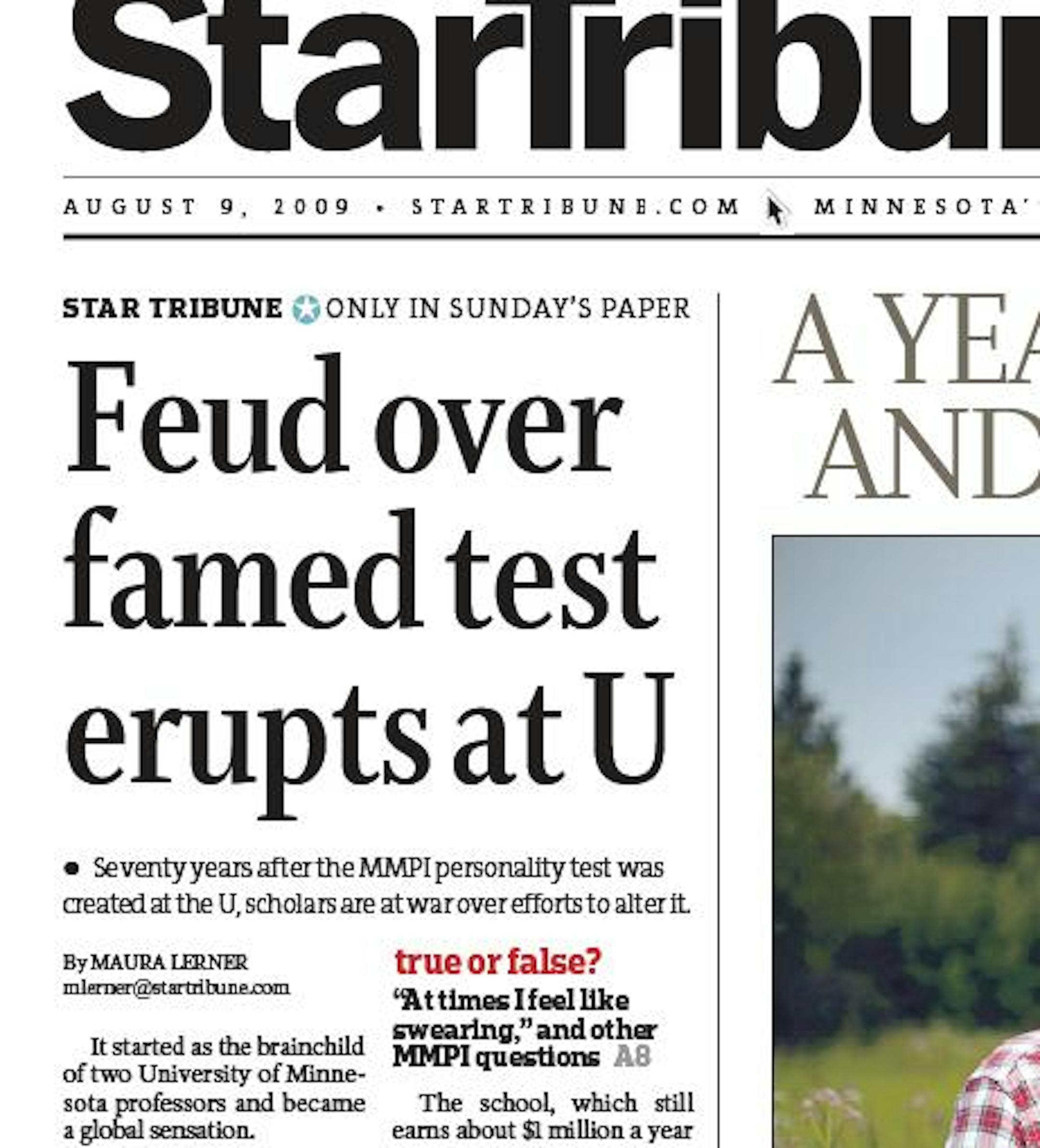 But I also wanted to share to share a fascinating story on the history of the MMPI, by Maura Lerner. Her 2009 article, "Feud over famed test erupts at the U," gives a behind-the-scenes look at the academic controversy surrounding the new version of the psychological assessment.