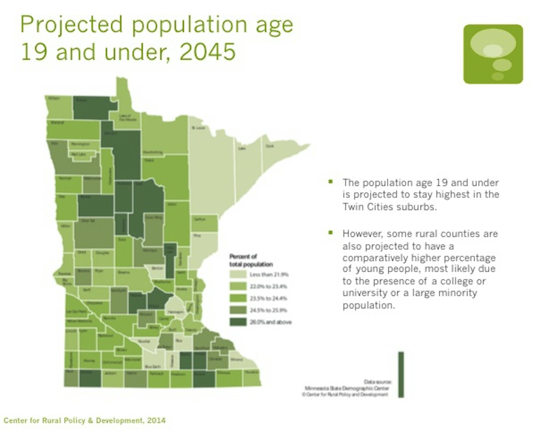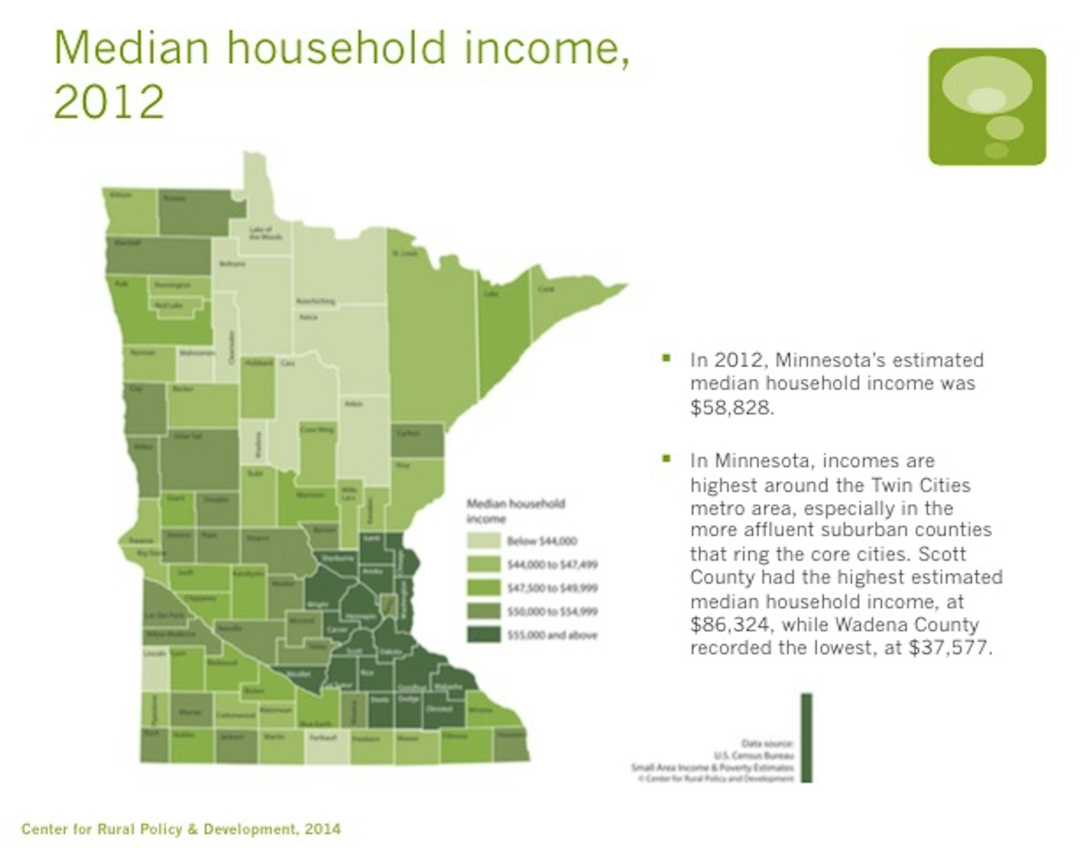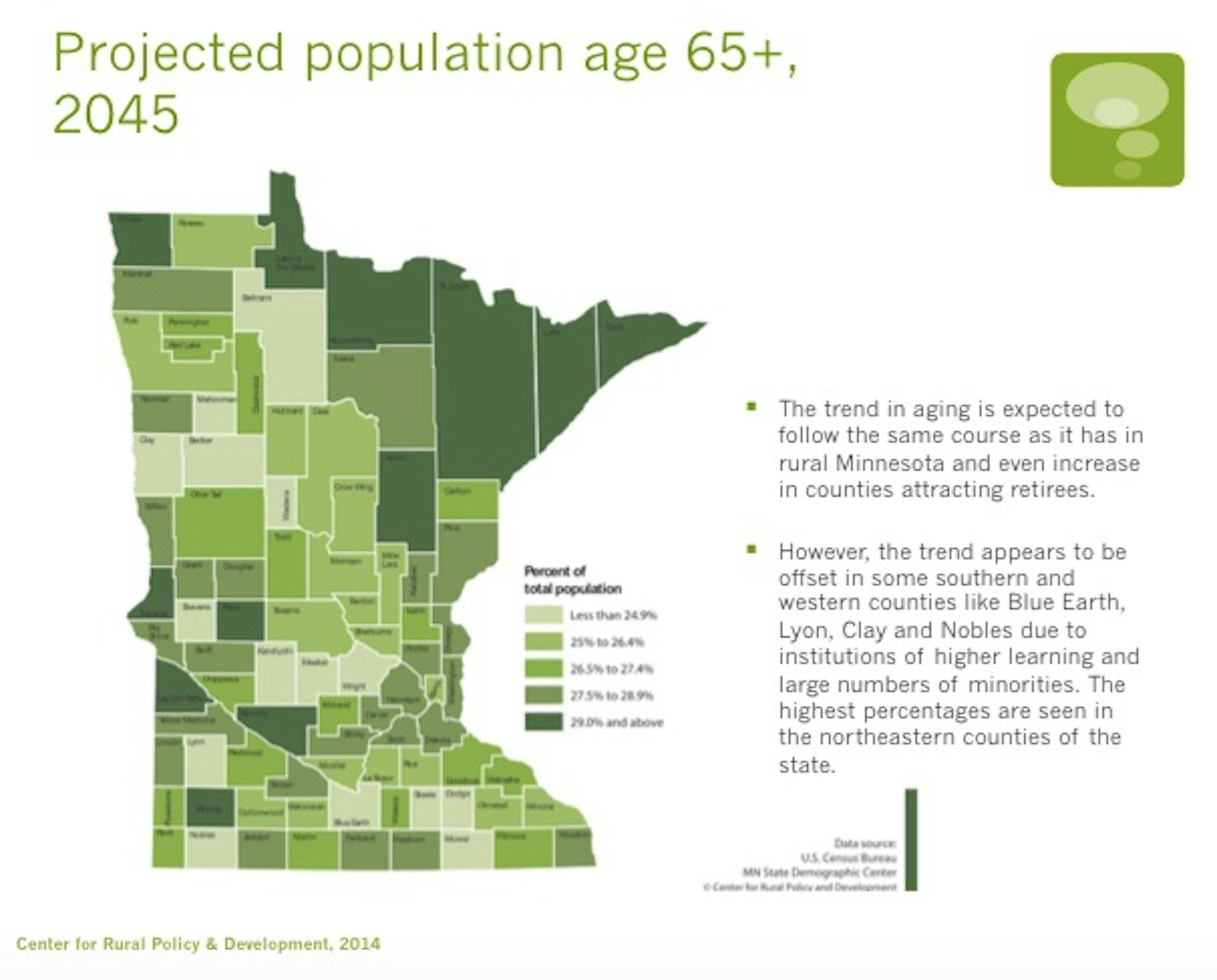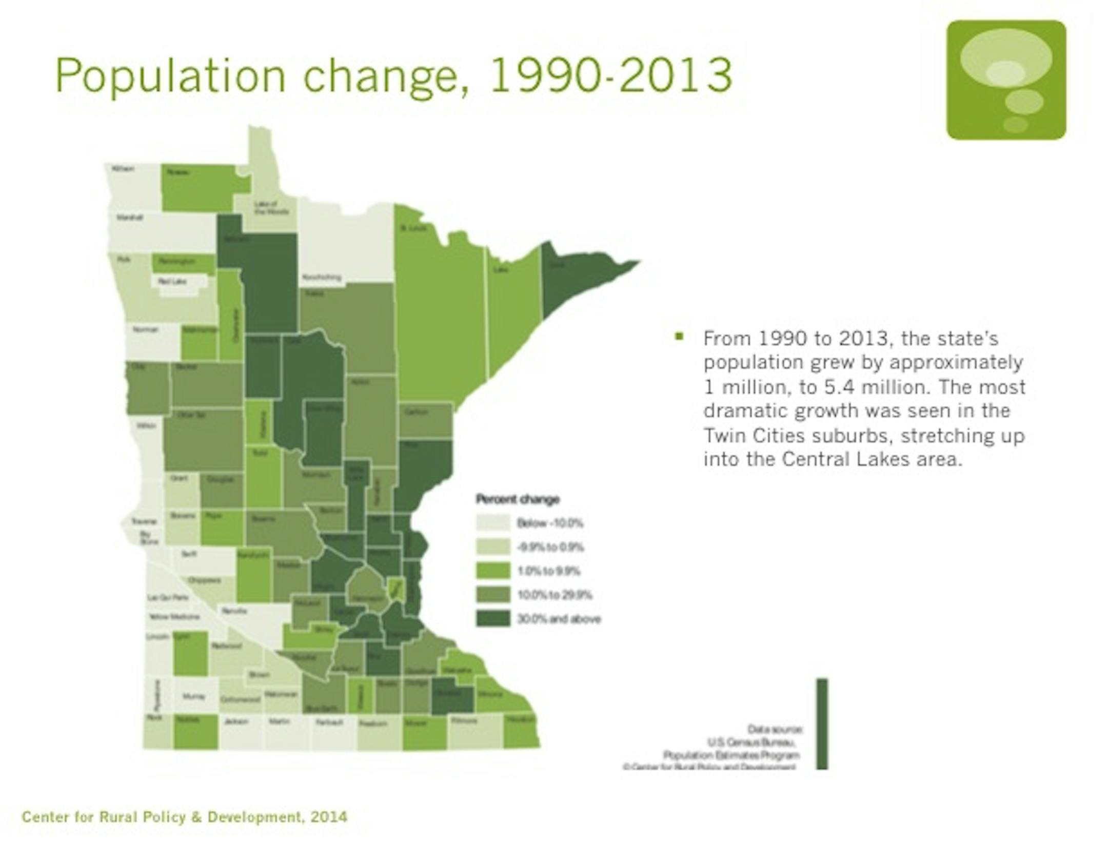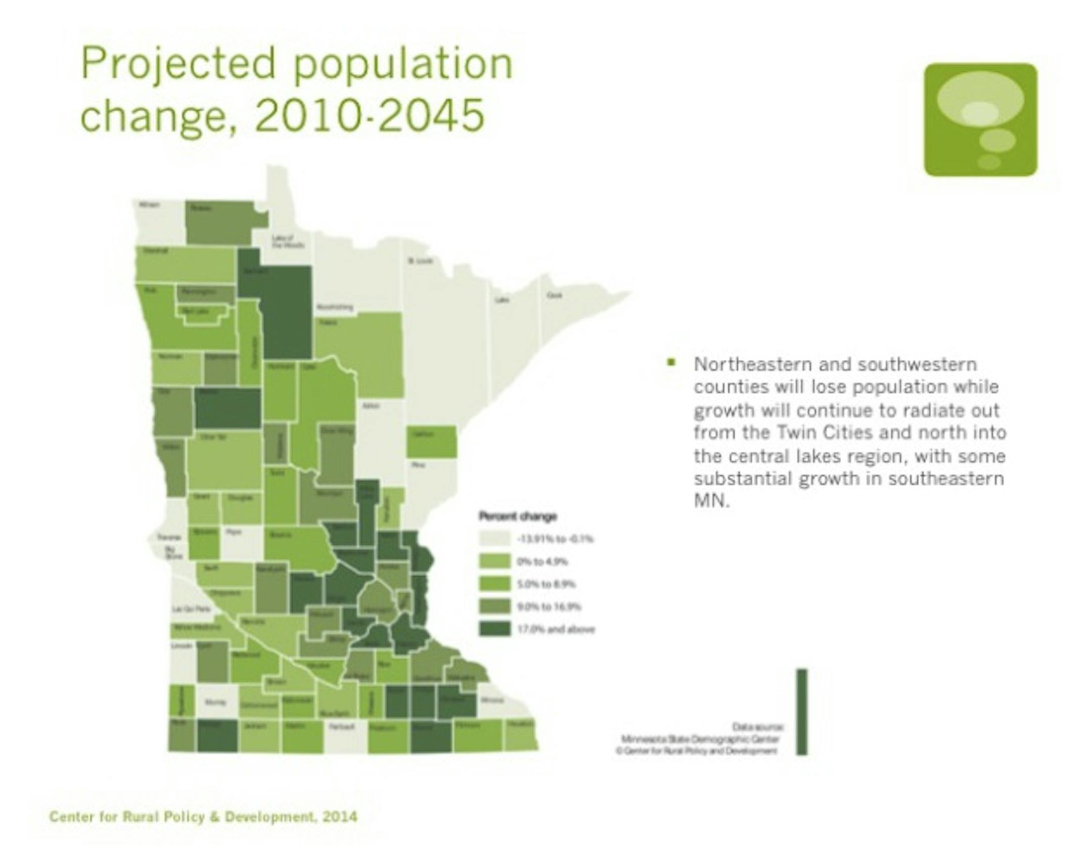 The Center for Rural Policy and Development issued its State of Rural Minnesota 2014 Report this week, including a number of compelling graphics about the current and projected economic status of Greater Minnesota counties.
