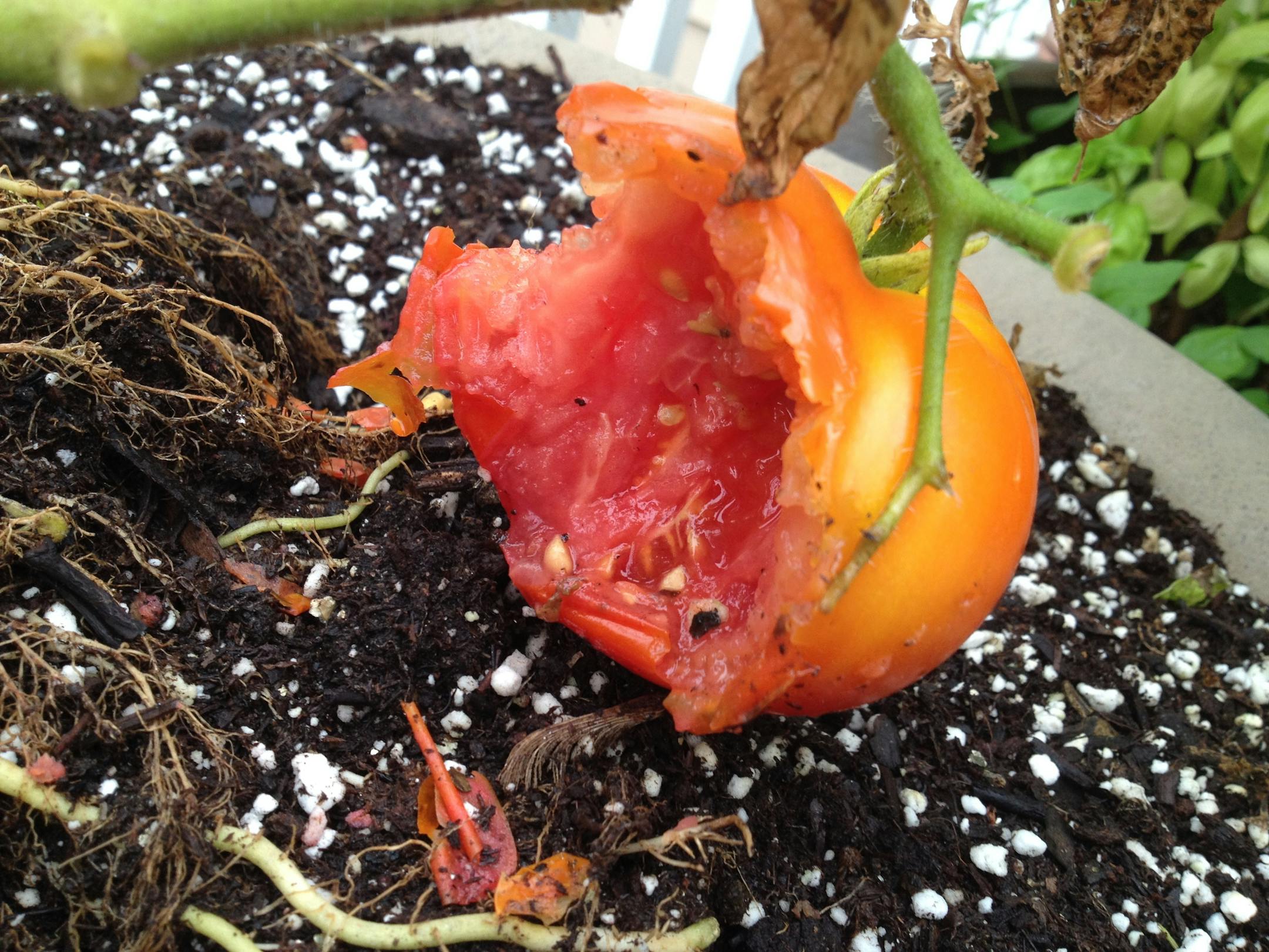 THE UGLY: An intruder has discovered my awesomely delicious tomatoes. Every morning when I check the vines, there are two or three more tomatoes with giant gaping bites taken out of them. I suspect the bold chipmunk I often see darting around my deck. But we also have an army of squirrels snacking on maple seeds in the tree right above my tomato pots, so it could be one of them. I'm glad they're enjoying them -- we have enough to share.