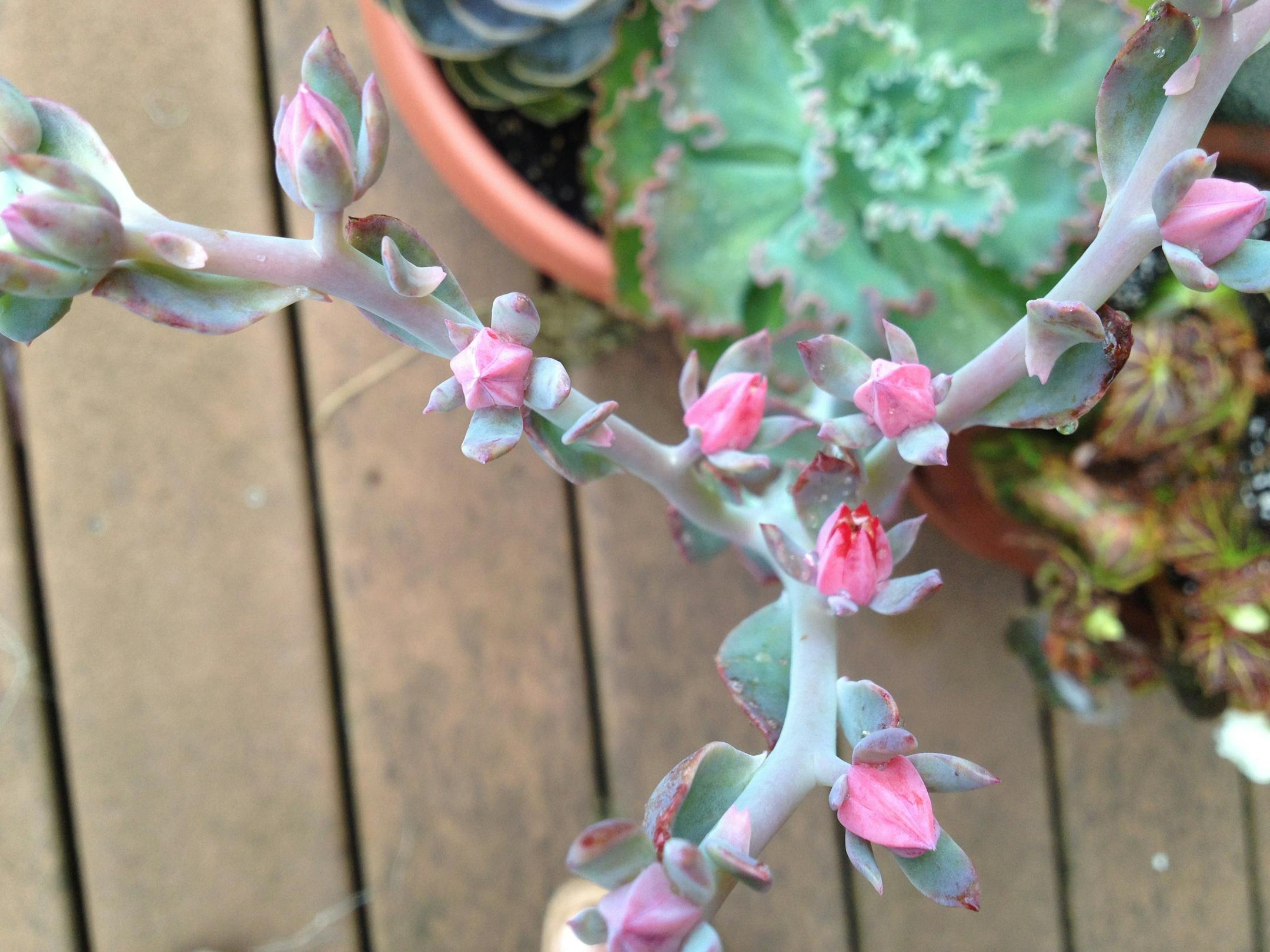 On the ornamental front, one of my succulents surprised me by shooting off a long arm, which is now covered with hot-pink buds. I've never gotten a succulent to flower before. Cool!