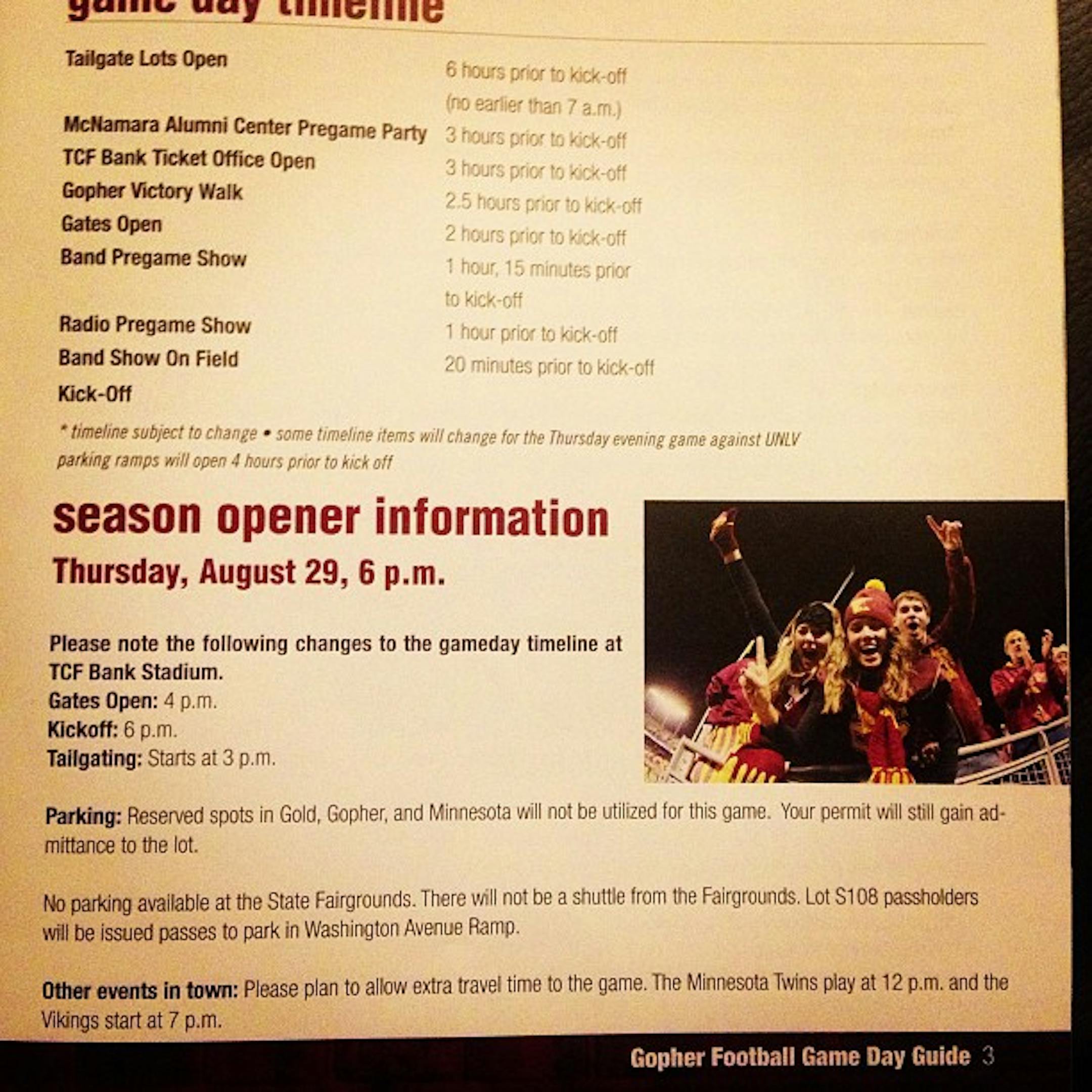 Beyond the logistical issues affecting parking and tailgating, this decision impacts Gopher fans on more personal levels as well. For instance, many people took off a full day of work for this game so that they could enjoy an afternoon of tailgating. Had they known the parking lots wouldn't open until 3pm, they could have just ducked out from work a little early to make it instead. And with the game less than a month away, not everyone will be able to change their schedules to recoup the wasted PTO.