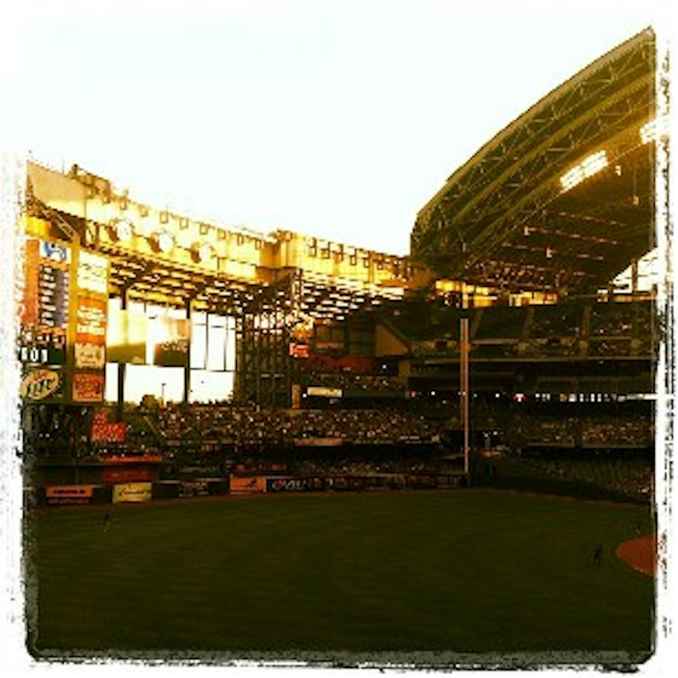 On Friday, however, the stars aligned. We started with a good ol' Wisconsin tailgate, which we have to grudgingly admit our eastern neighbors do quite well. After three brats and three New Glarus products, we had the proper base to enjoy the game. Our seats were on the third base side, providing a much better look at the stadium. And by some meteorological miracle, the roof was wide open on a glorious night. All we needed on top of that was a reasonable performance by the Twins, which was -- shockingly based on this season and our GBRT history -- delivered with enthusiasm.