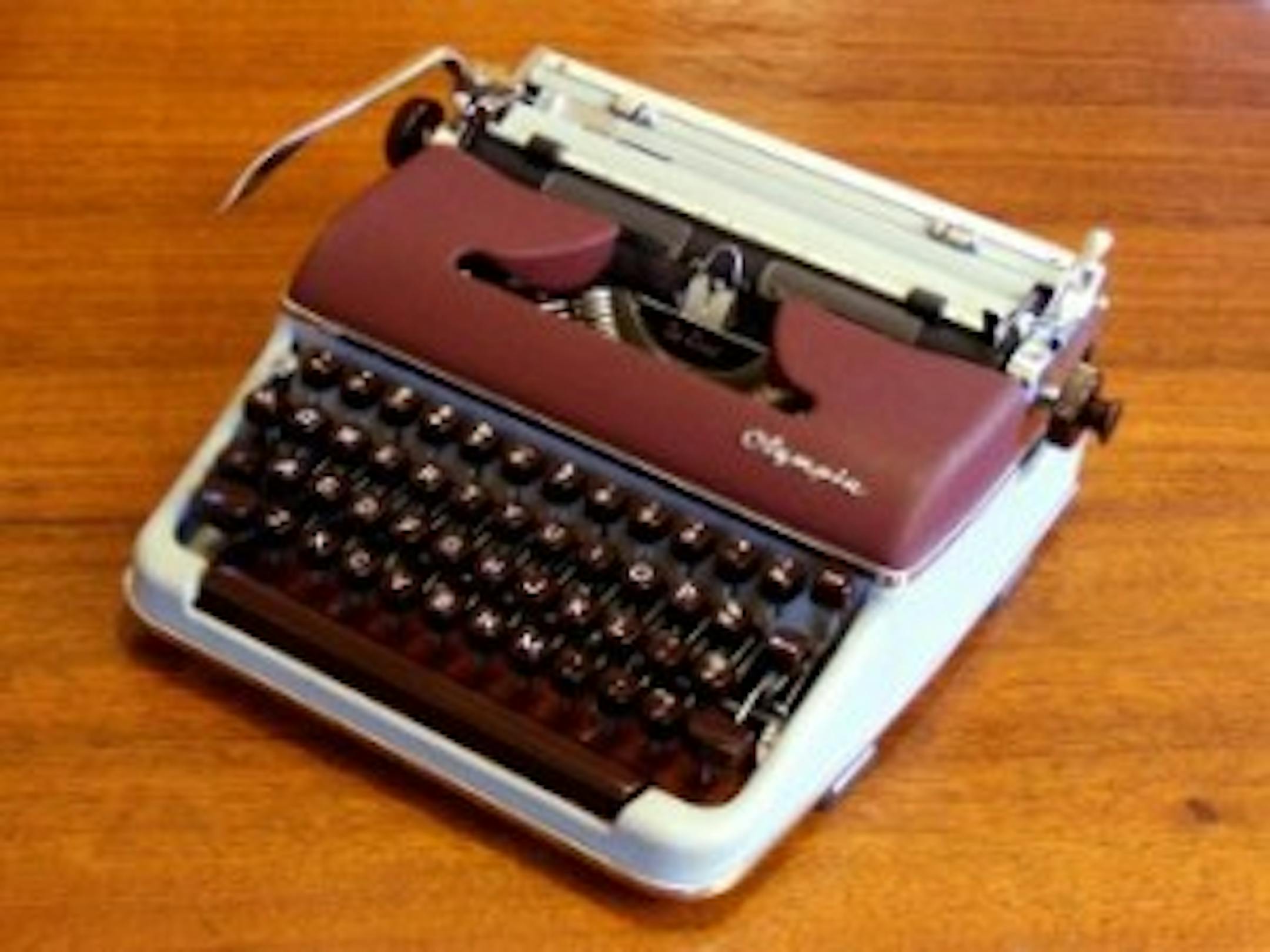 Ah, Nirvana. I wanted an Olympia portable. They are very well made and heavy enough not to jump around. My preference was classic green. Many very attractive machines were in stock: green, brown, maroon and an interesting two-tone. The Boss instantly seized on that one. I have never run across anything like it in my Internet searches. Maroon top and gray bottom with chrome return and trim. There is one small chip on the front, patina as The Boss would say. Deal done. This machine is now my first choice for original drafts.