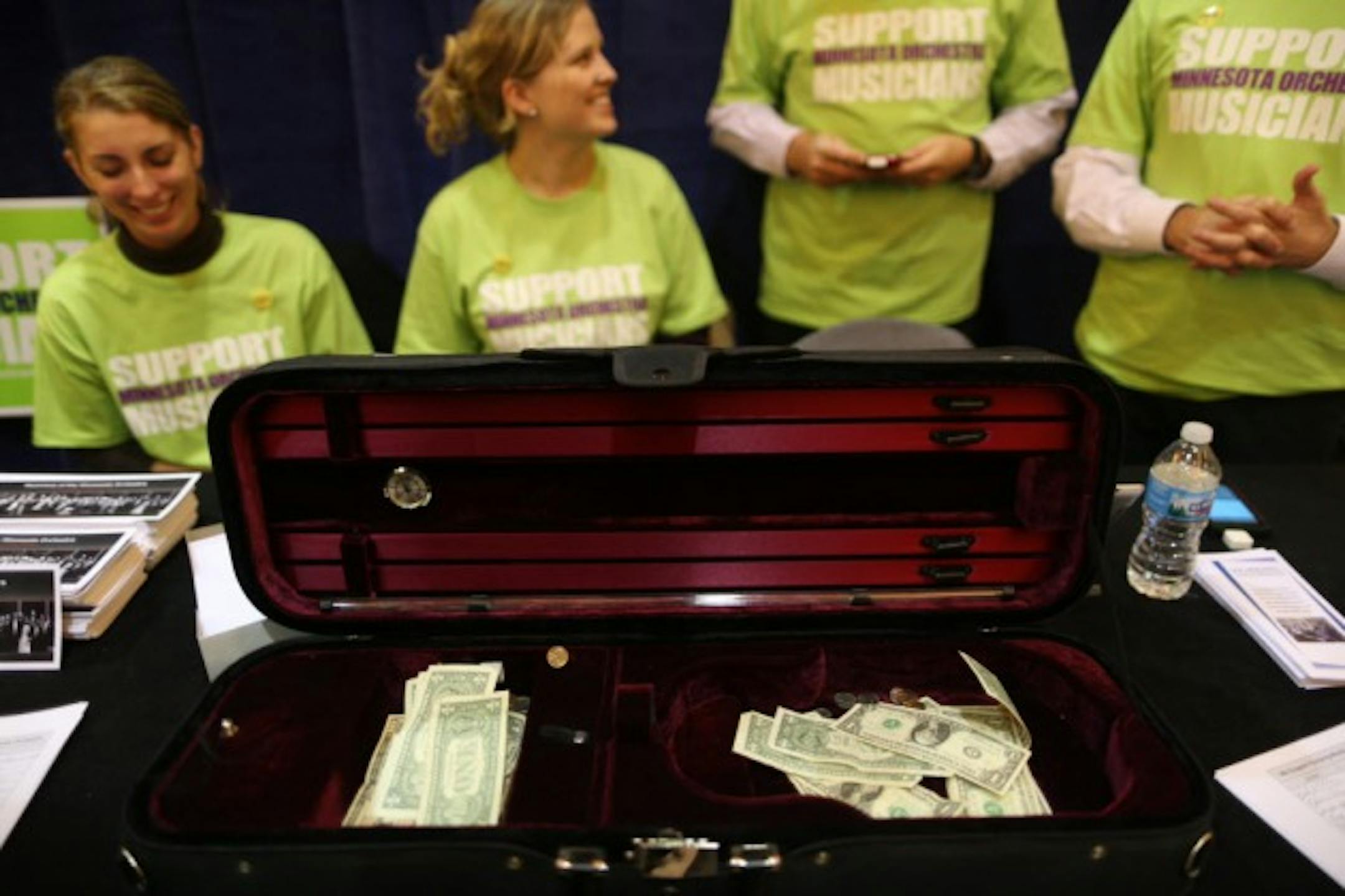 Musicians greeted each other Thursday night at the Minneapolis Convention Center. Below, volunteers collected donations and petition signatures. Photos by Renee Schneider Jones.There was evidence of a labor rally, and evidence of serious classical music Thursday at the concert by musicians of the Minnesota Orchestra. Violist Sam Bergman spoke passionately about the musicians' cause when the players came back to the stage after intermission for the Shostakovich No. 5. Bergman called the orchestra a musical institution that "stands in nobody's shadow." He also critiqued the Orchestra Hall lobby renovation – which has become a rallying point for critics of management – and noted that the institution has the sixth largest endowment of any U.S. orchestra.Otherwise, within the acoustically challenged confines of the Minneapolis Convention Center Auditorium, this was a concert that did not seem to have been put together in a hurry – even though it was. It demonstrated the world-class virtuosity of these players, even though they were missing a few of their mates. Violist Ken Freed, for example, couldn't be there because he was doing a temporary gig with the New York Philharmonic. Clarinetist Tim Zavadil was sitting in with the Cleveland Orchestra.Those absences, and others, contributed to a little sadness because these are familiar faces and one wondered if there is a time when other faces will no longer be on the stage.Outside the auditorium, the partisan crowd showed its colors in long queues to buy t-shirts, lawn signs and buttons – or to simply pitch a few bucks into an open violin case. Elizabeth Barnes of Richfield didn't need any prompting to share her views on the labor dispute between the players and management.