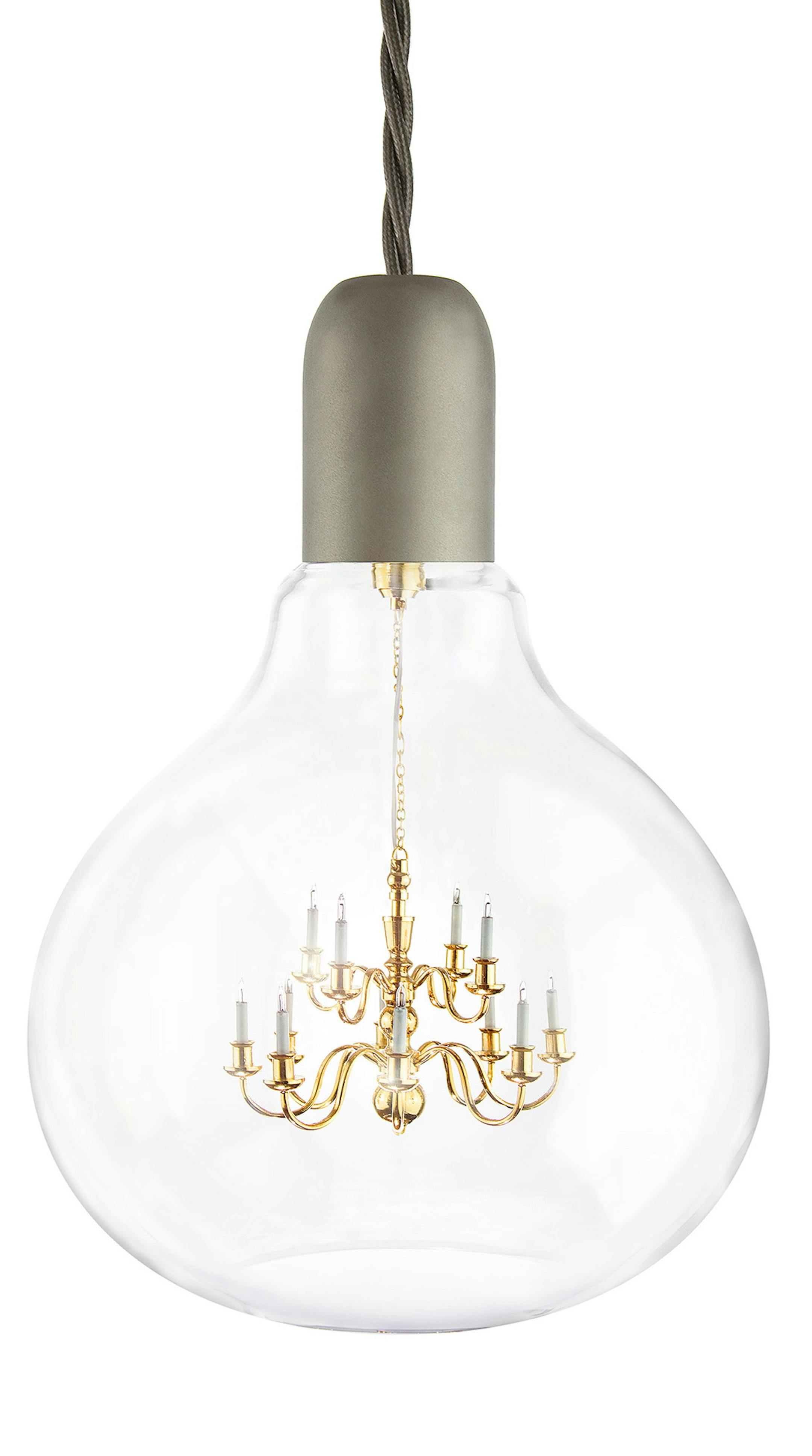 But the current mother of all Edison bulb-style mash-ups might be the illuminated mind game that is the King Edison Pendant Lamp designed by Young & Battaglia for Mineheart and unveiled at the Milan Furniture Fair this spring. It features a miniature brass chandelier inside a hand-blown 8-inch-tall clear glass light bulb suspended from a silk cable — and comes with a royal price tag of just over $750.