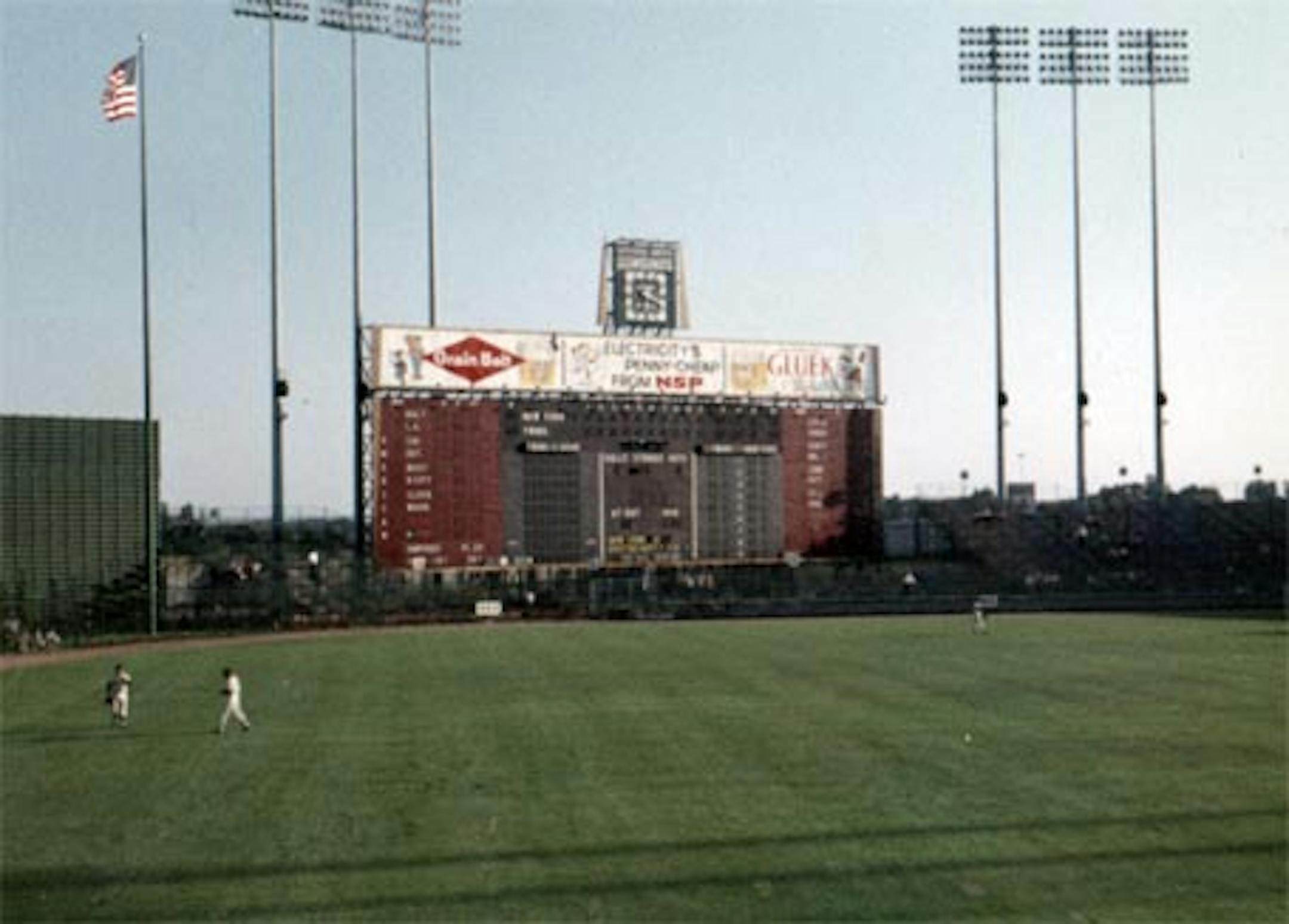 Early evening game? Seems so, from the shadows and the sky. A detail of the scoreboard: