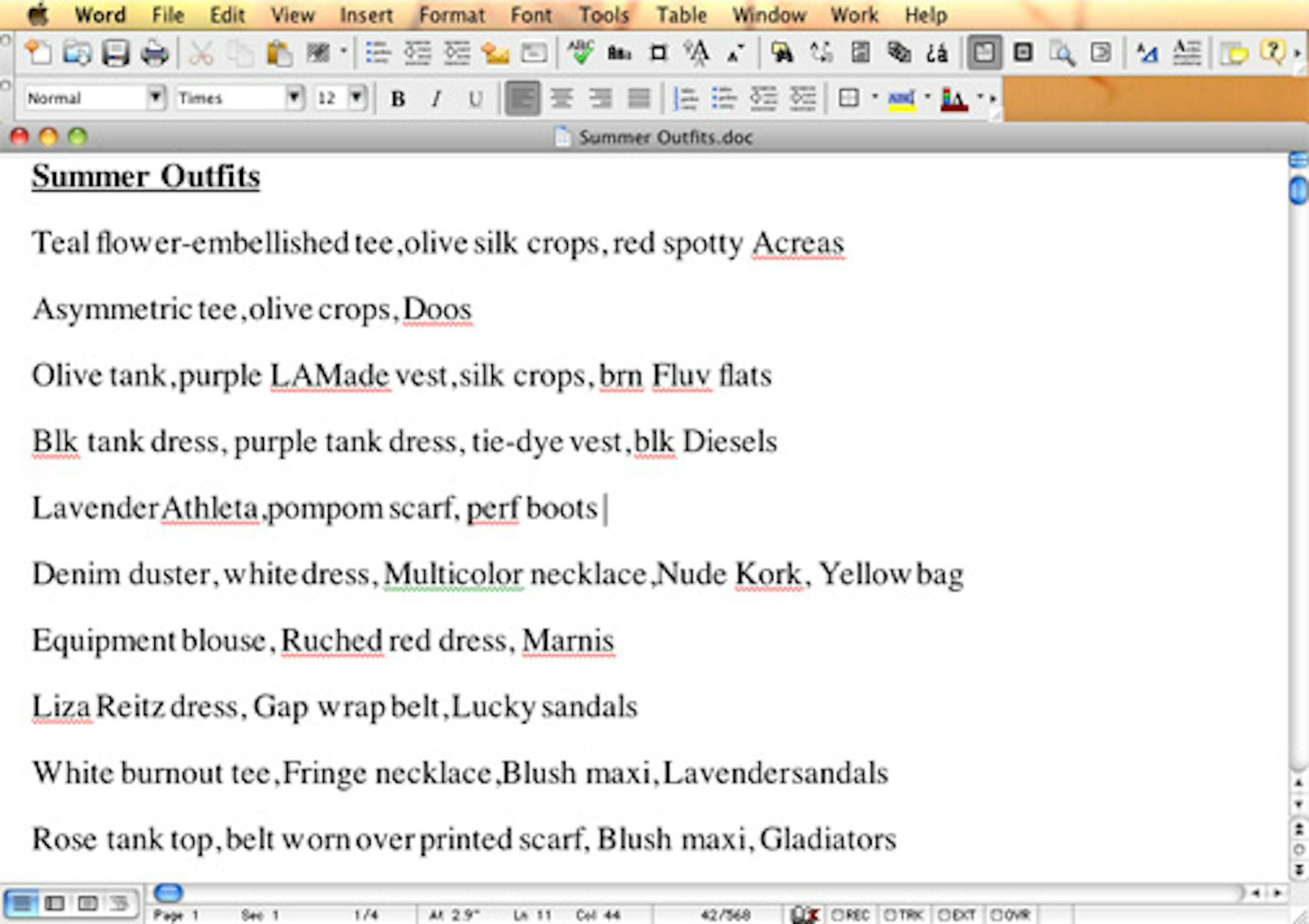 - I can use the "find" function in Word to search for specific items. If I want to wear an outfit with pants, I can quickly locate all instances of "pants" in the current season's list. (This is the biggie.)