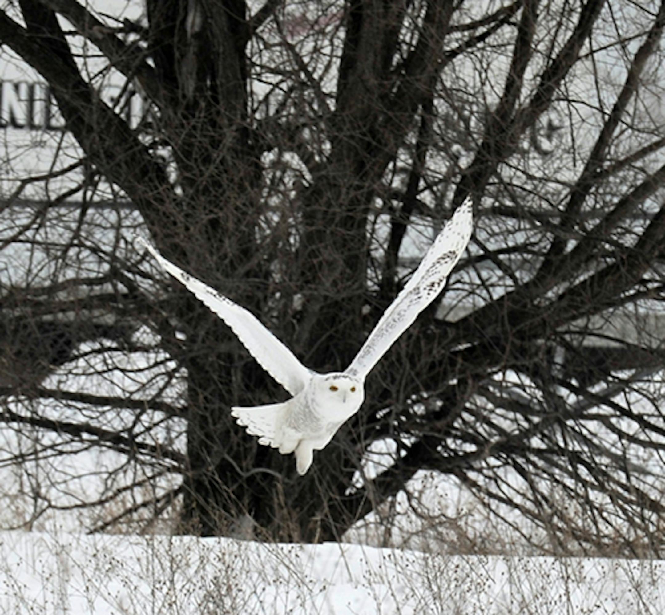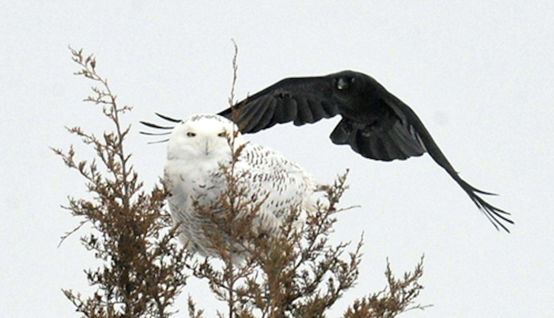 The owl barely reacted to several attacks by a pair of crows.