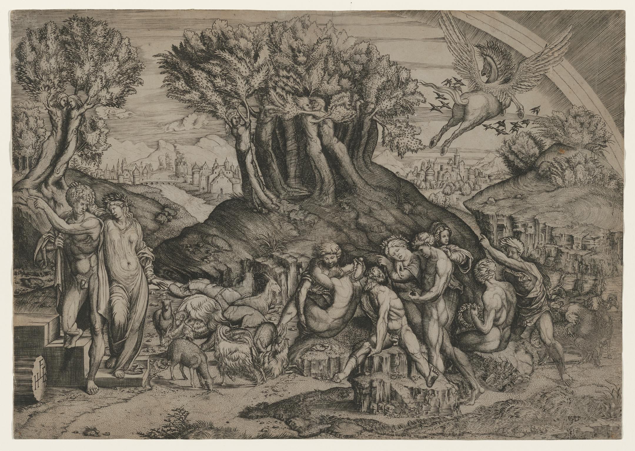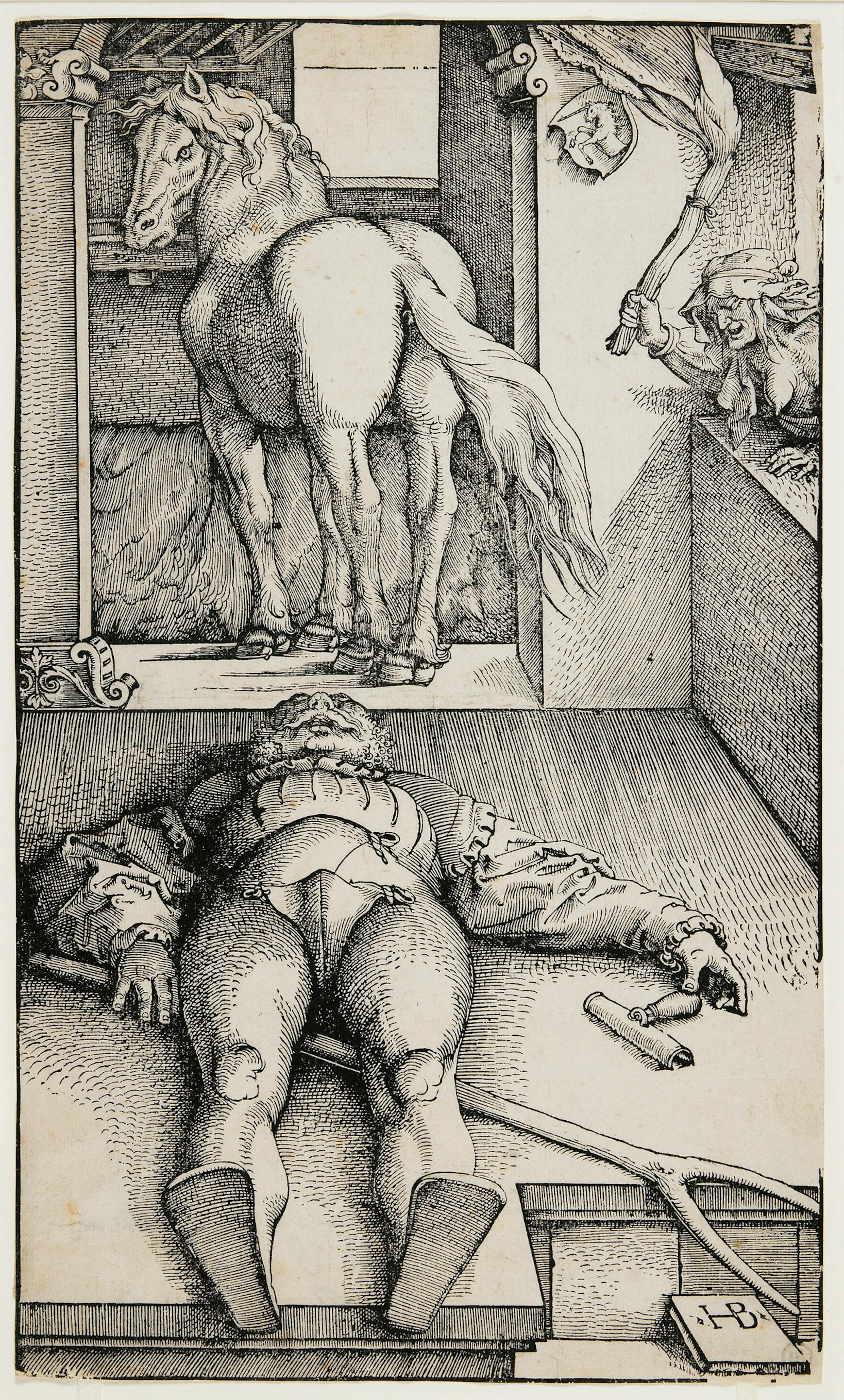 A 16th-century engraving of a rhinoceros with scaly skin emerges as part-lizard, part-beast. A witchy woman and a suspicious horse peer at a man, mysteriously lying dead on the ground. Tree trunks transformed partially into human figures are having sex and running wild.