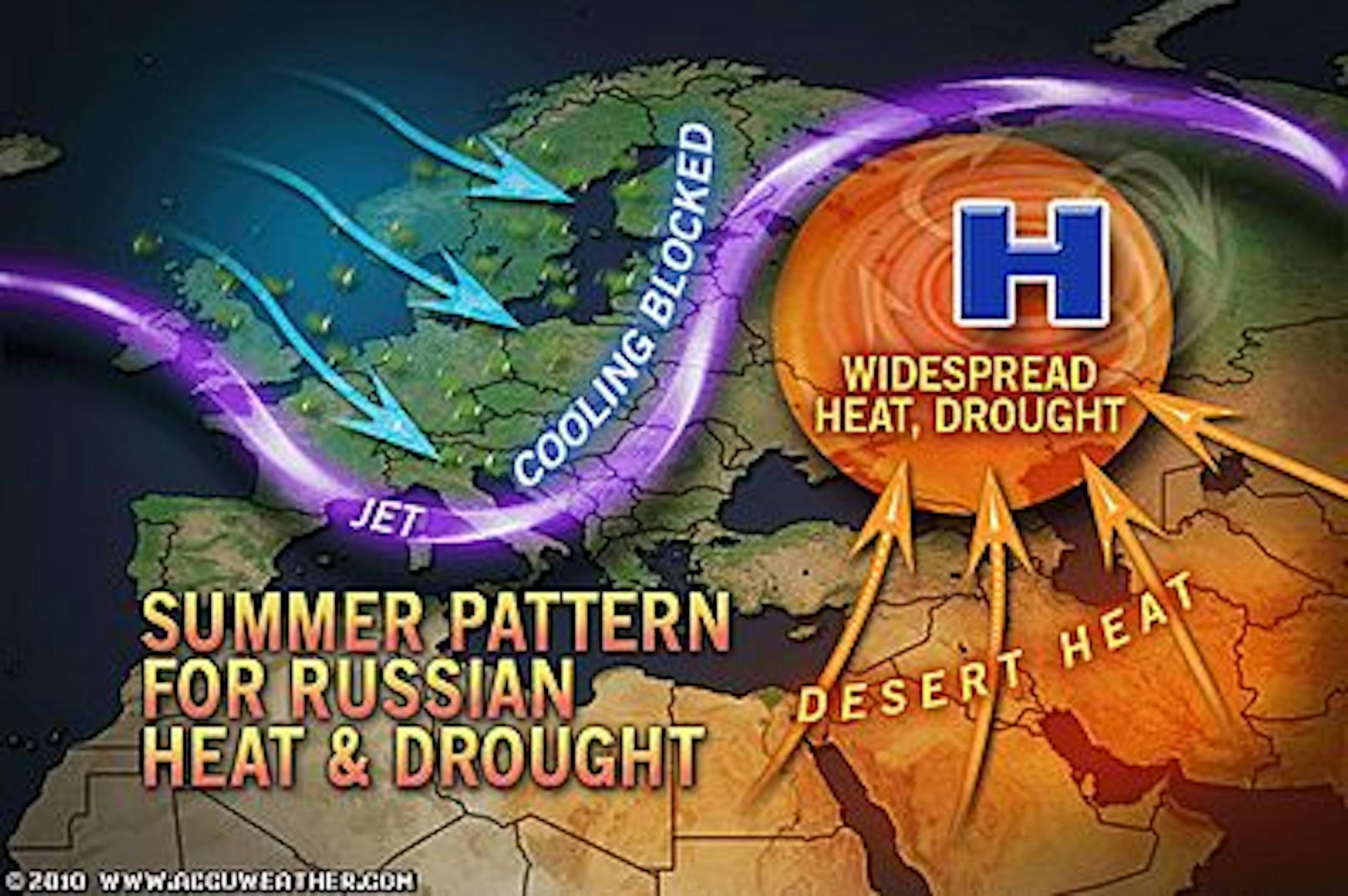 According to Andrews, a strong upper-atmospheric high, or ridge, built overEuropean Russia toward the beginning of summer. In doing so, it diverted thejet stream and its rain-giving train of summer storms farther north than usual,giving much of the area drought conditions this summer.