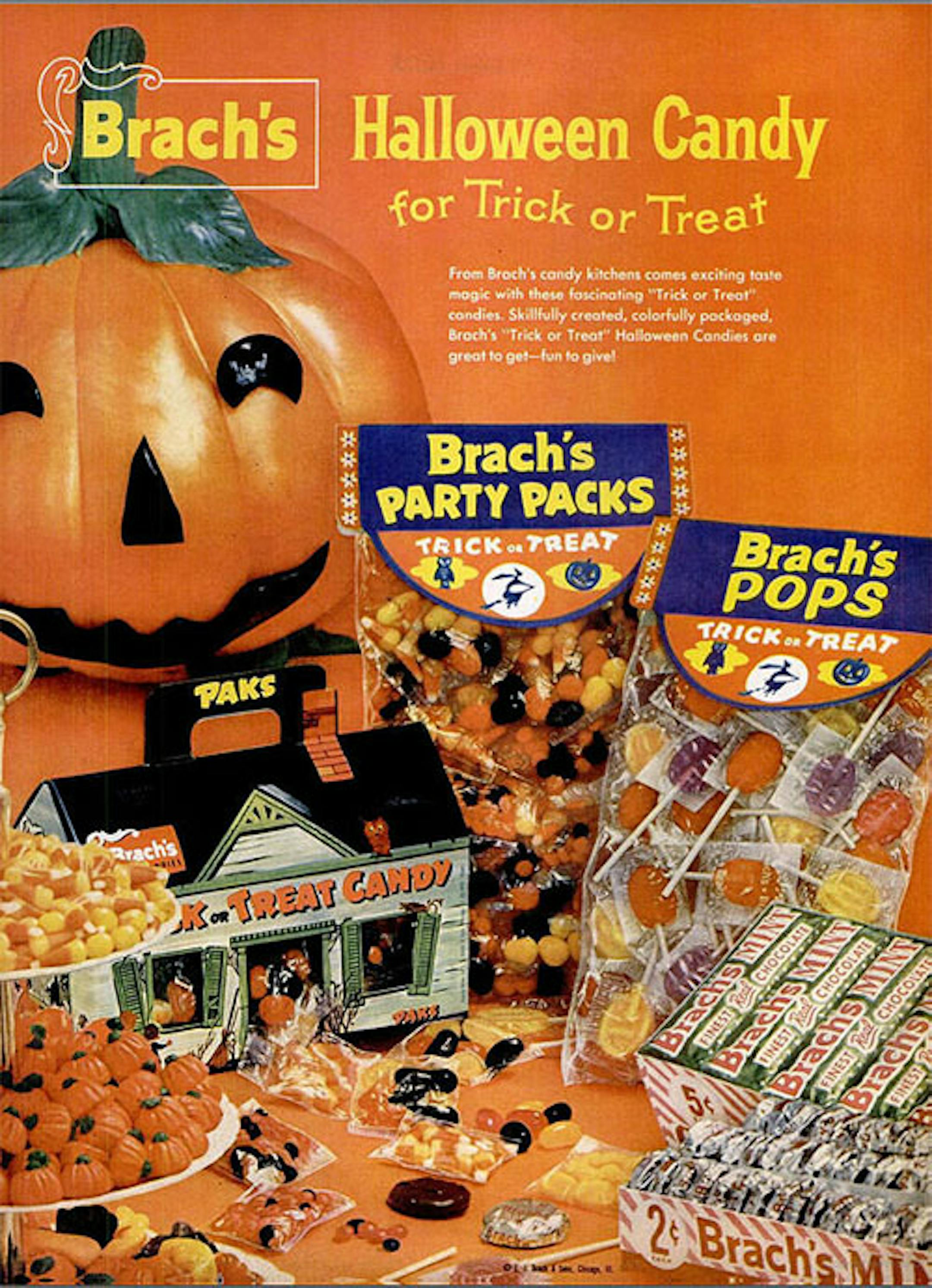 Meh. "Fear" and "anxiety" seem a bit overstated. But the article notes that "Brachs, for example, was advertising seasonal Halloween candy with jack o'lanterns and trick-or-treaters on the boxes as early as 1962," and that's about right. I found an example in Life: