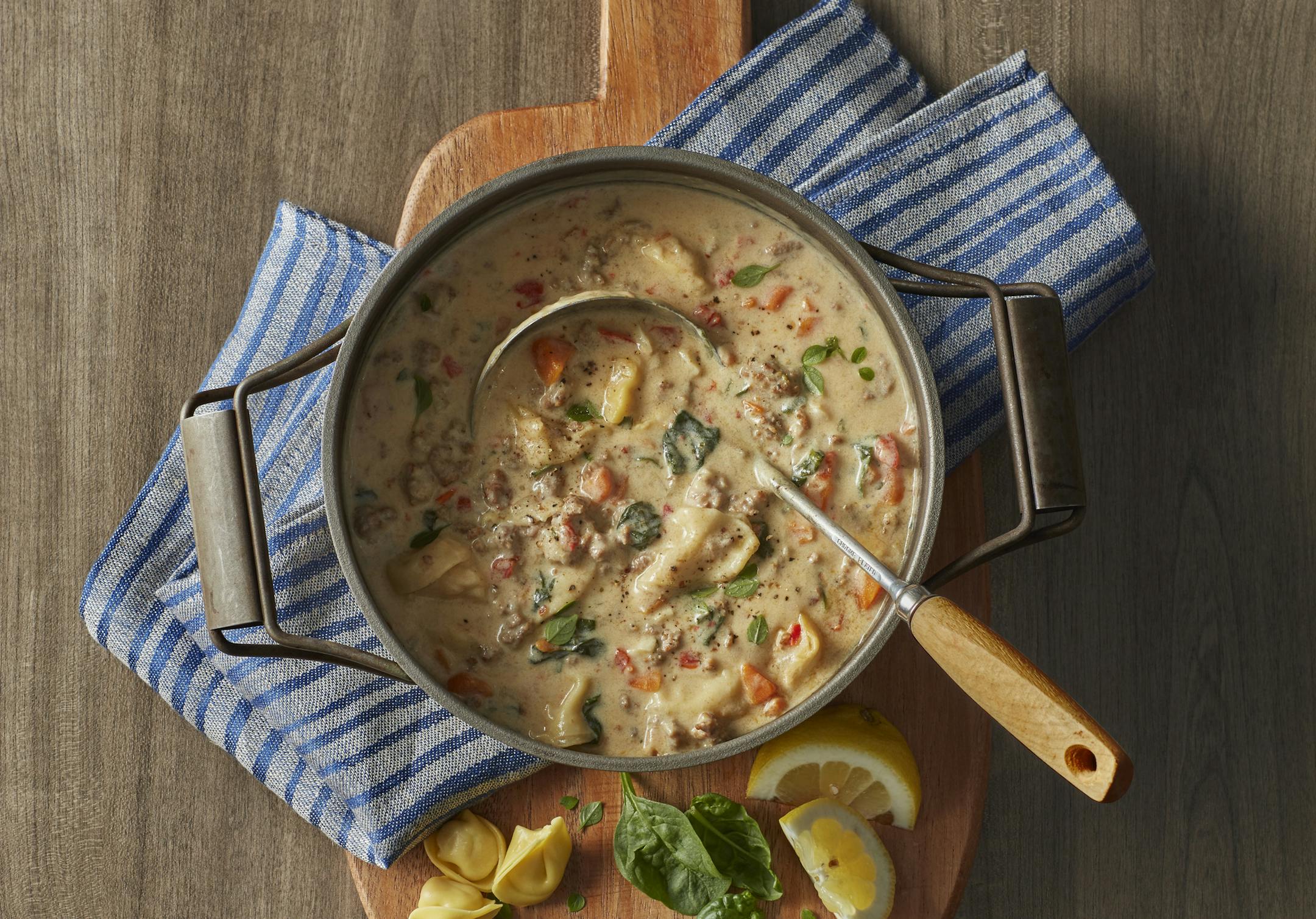 Imagine, if you will, a world where your fridge was stocked with a family-pleasing, satisfying soup base, like Creamy Sausage, Tortellini, Spinach and Basil Soup. All you need to do is heat it up with some broth and toss in a few fresh ingredients, such as refrigerated tortellini, baby spinach and basil.