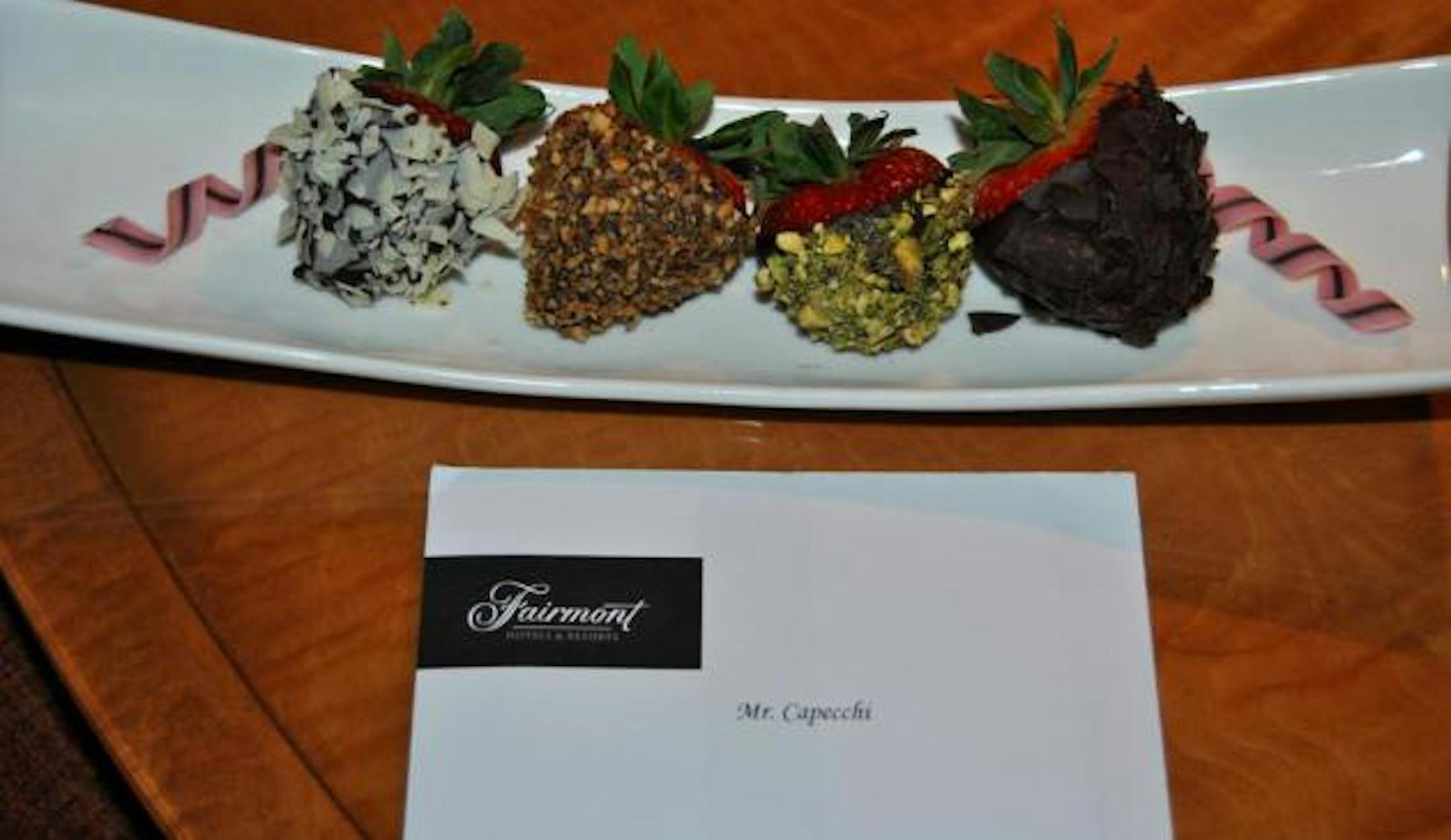 I had seen the photo galleries on the website and knew I was in for a treat, but didn't fully appreciate what I was in for until I made the two-minute stroll from the luggage carousels to the hotel's entrance via a grand, spiral staircase. I was immediately welcomed to the hotel by a courteous staff member, then went up to the top level where I was greeted again by two concierges specifically assigned to the top floor. They led me to my room, where I was greeted with this spectacular view, and––as a delicious surprise––a spread of chocolate-covered strawberries.