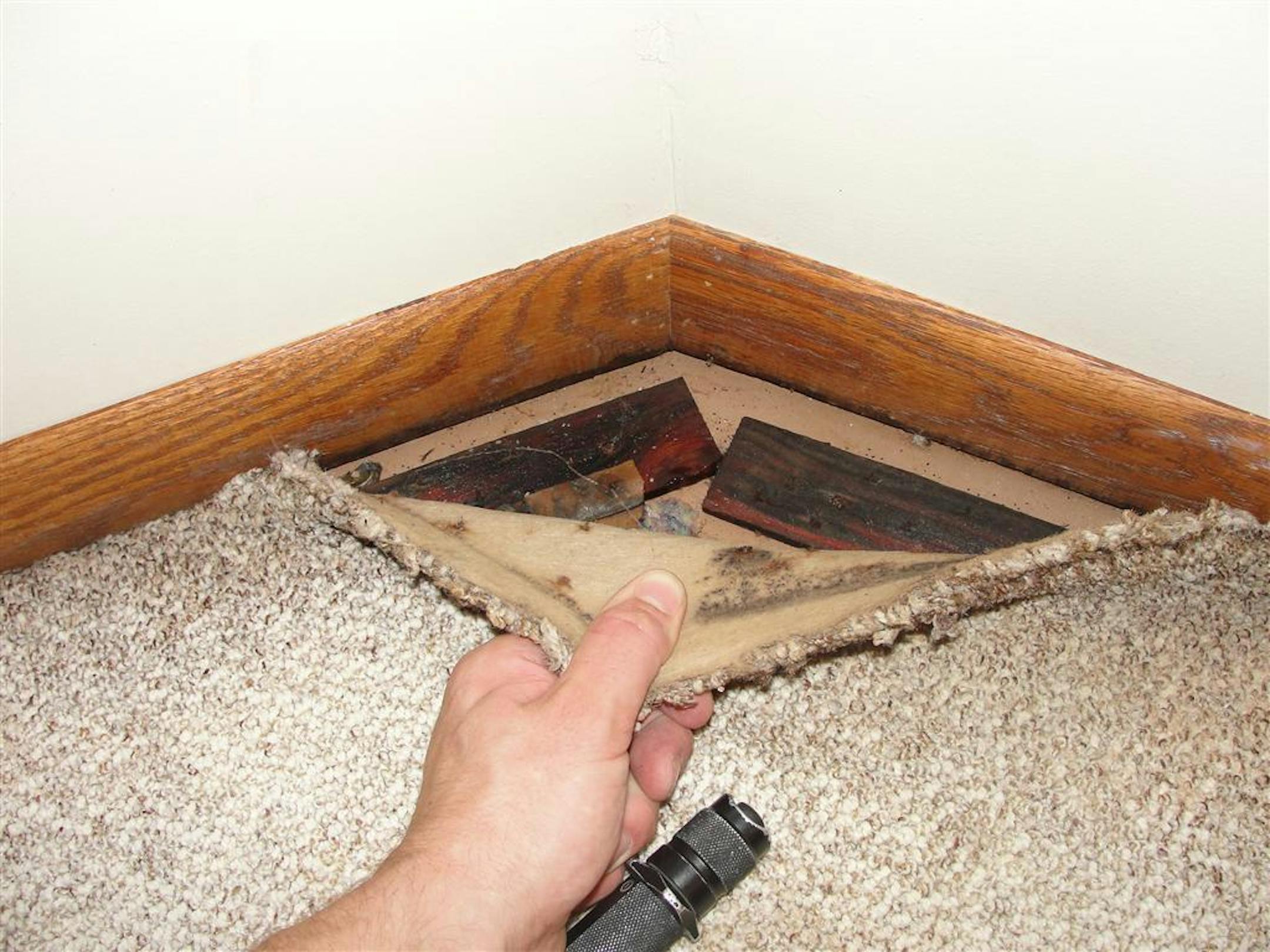 We frequently pull back carpet in the corners of basement rooms where we suspect water issues. A less objective method for finding mold, but surely just as reliable, is to simply get down and smell your carpeting. If it smells moldy, it probably is.