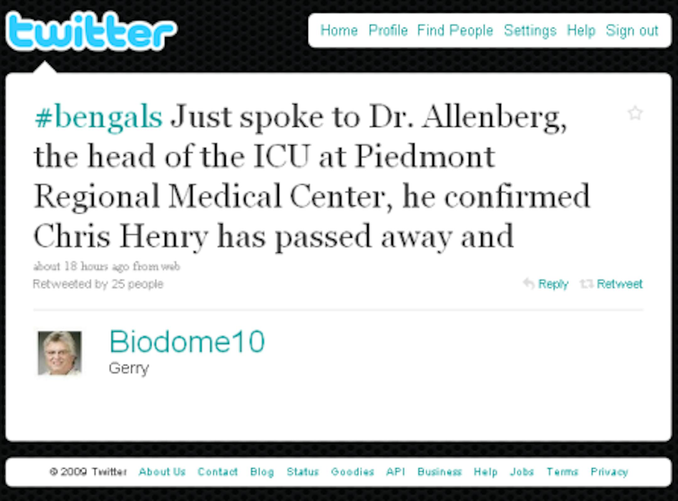 But we are not here to wax poetic about the death, however terrible it was. Rather, we want to take this opportunity to examine both the blessings and the curses of modern technology. As news of Henry's accident spread last night, the vast majority of official reports said Henry was in dire condition but still alive. There was one, however, that seemed to have more information than others: a series of tweets from the Twitter account of "Biodome10," who claimed to be a reporter for the Dallas Morning News. Around 5 p.m., tweets started coming from the account. One indicated a death confirmation from a doctor (pictured). Another indicated confirmation from a Bengals spokesperson. It seemed odd that such news would be coming from a Dallas Morning News reporter -- no connection to the team or the site of the accident -- but it made it through an initial filter.
