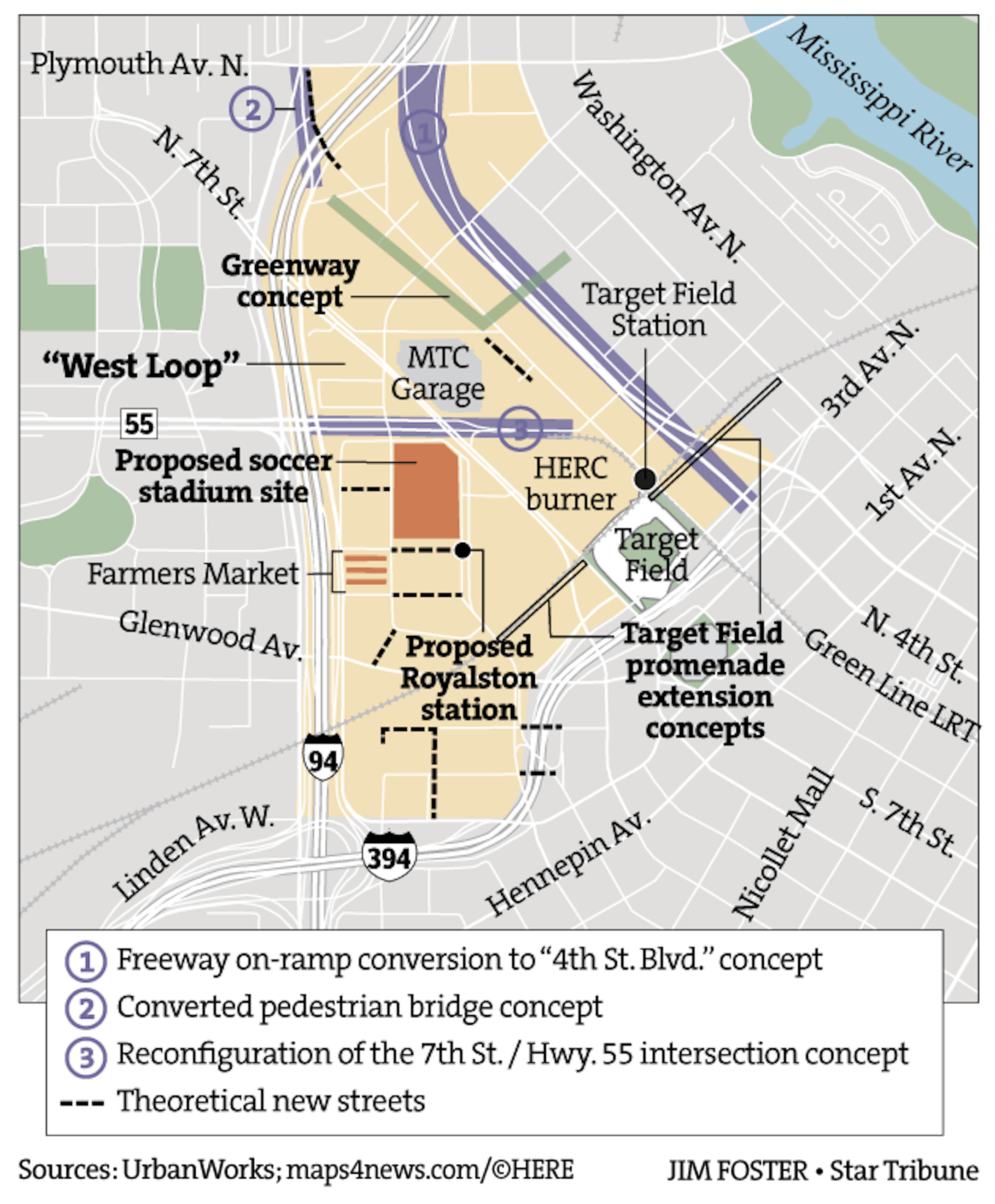 Despite its proximity to both downtown and North Loop, the area surrounding the proposed soccer stadium remains largely underutilized. Architects at UrbanWorks have theorized about possible future improvements.