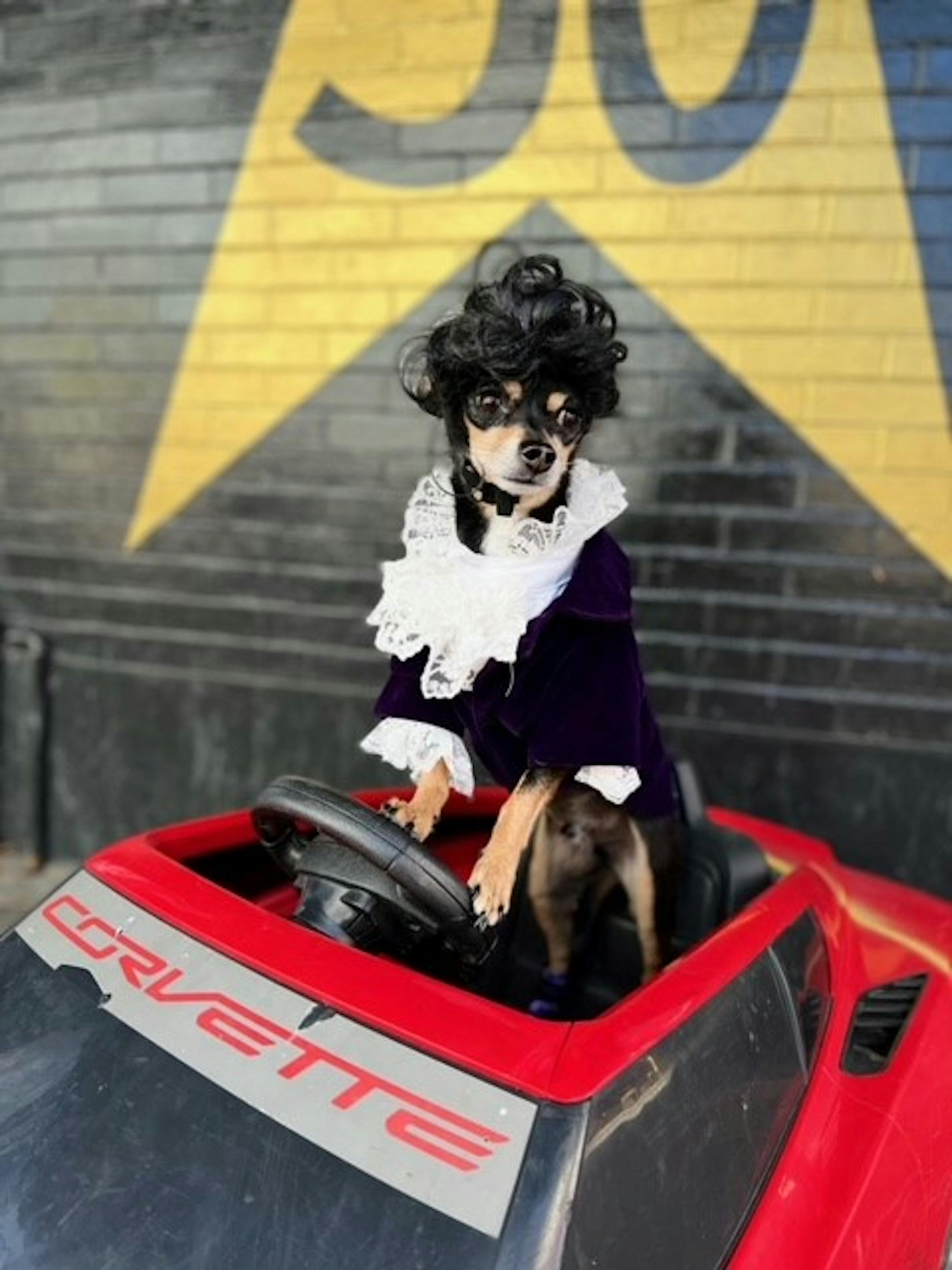 Elko resident Nicole French commissioned a custom outfit with lace cuffs and a ruffle collar from an Etsy artisan. She got some purple dog shoes on eBay, found a used little red kiddie Corvette and even got a wig for her dog, Diesel, a miniature pinscher/chihuahua mix.